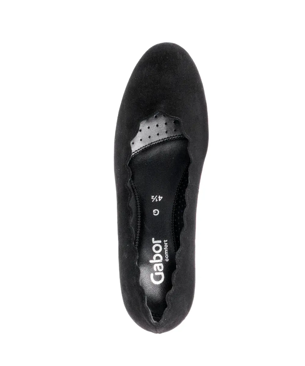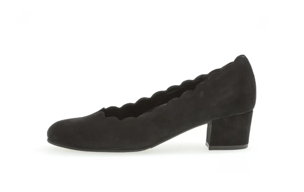 Ontdek de elegantie van Gabor's klassieke zwarte suede pumps, een tijdloze toevoeging aan je garderobe. Deze pumps zijn ontworpen met een subtiele golfaccent en een beklede hak die zorgt voor een verfijnde uitstraling bij elke stap die je zet.