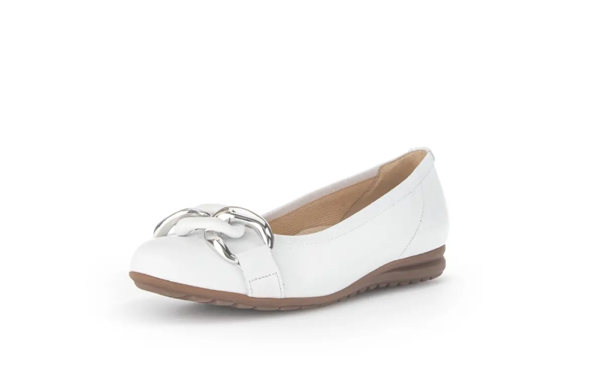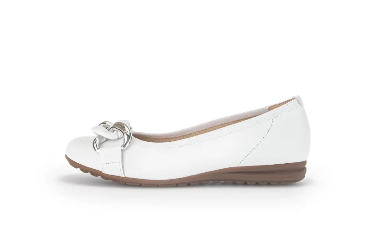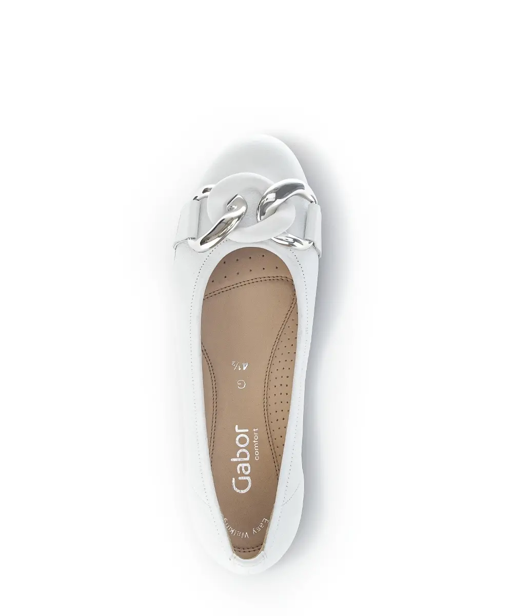 Ervaar comfort en stijl met onze Gabor Ballerina's in wit nappaleer. De sportieve bruine zool biedt comfort, terwijl de elastische instap en matte schakelketting zorgen voor een moeiteloze pasvorm en een elegante touch. Perfect voor elke gelegenheid.