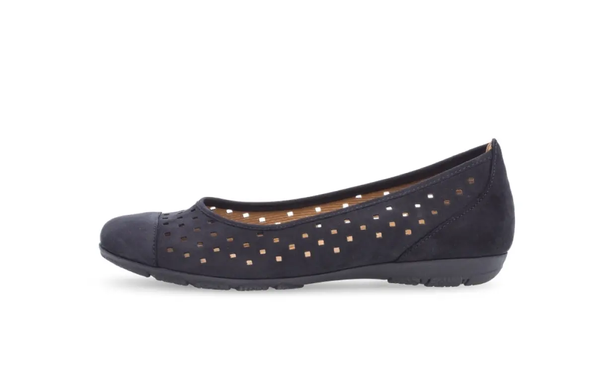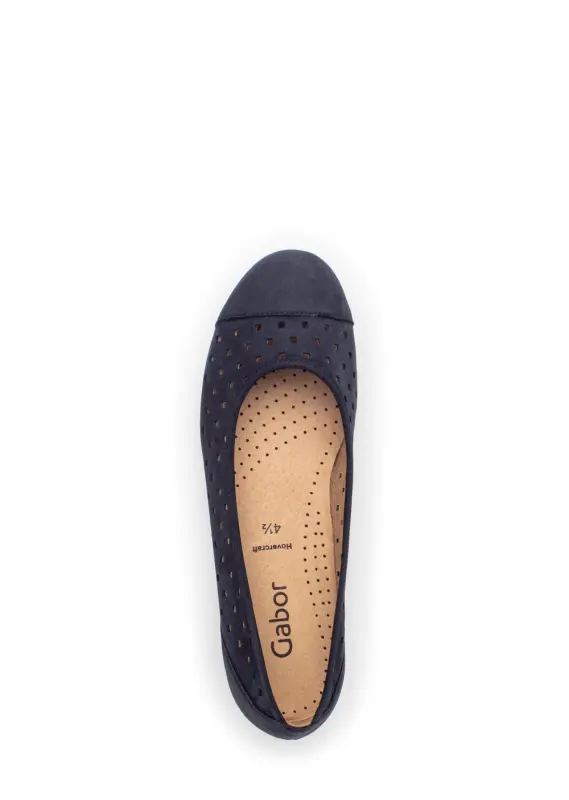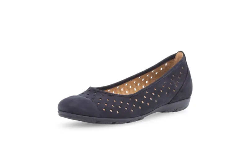Verrijk je garderobe met deze tijdloze klassiekers. Onze donkerblauwe Gabor ballerina's, vervaardigd uit het fijnste nubuck en verfraaid met subtiele gaatjes, bieden een ongeëvenaard comfort in F wijdte en hovercraft technologie. Perfect voor elke gelegenheid, waarbij stijl en gemak hand in hand gaan.
