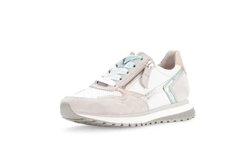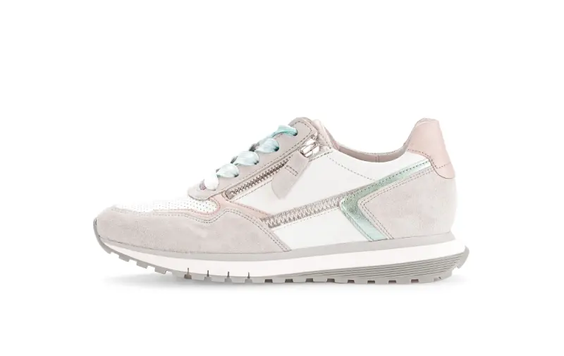Geniet van stijl en comfort met onze witte Gabor sneaker. Het zachte nappaleer en de subtiele metallic accenten geven je outfit net dat beetje extra flair. Met de kleuraccenten in de veters val je zeker op. Deze trendy schoenen zijn niet alleen mooi om te zien, maar ook praktisch dankzij de handige combinatie van veters en rits. Perfect voor een brede voet met H wijdte.