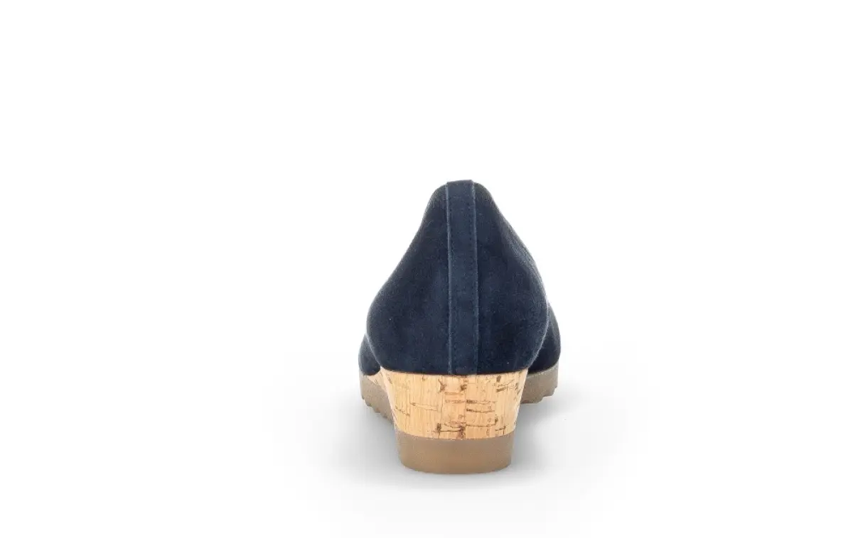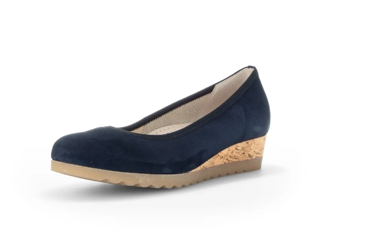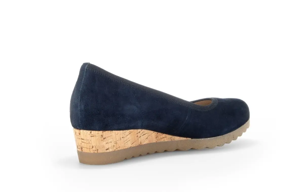 Breng luxe en comfort samen met deze Gabor ballerina in nachtblauwe suède. Het zachte materiaal geeft de schoen een elegante uitstraling. Dankzij de elastische rand sluit de schoen perfect aan op uw voet, wat zorgt voor optimaal draagcomfort. De opvallende kurken sleehak biedt een moderne twist, gecombineerd met een natuurlijke uitstraling en lichte verhoging. De gekartelde zool zorgt niet alleen voor extra grip, maar voegt ook een trendy accent toe.