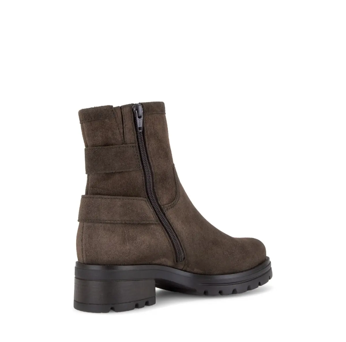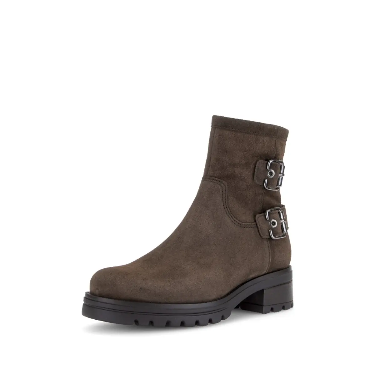 Deze donkerbruine enkellaars van velours is zowel stijlvol als robuust. De dubbele gespsluiting geeft een stoer accent, terwijl het zachte velours een luxe uitstraling en prettig draagcomfort biedt. Dankzij de stevige profielzool heb je extra grip en stabiliteit, ideaal voor dagelijks gebruik. Deze velours enkellaars voor dames laat zich moeiteloos combineren met zowel een casual look als een elegante outfit.