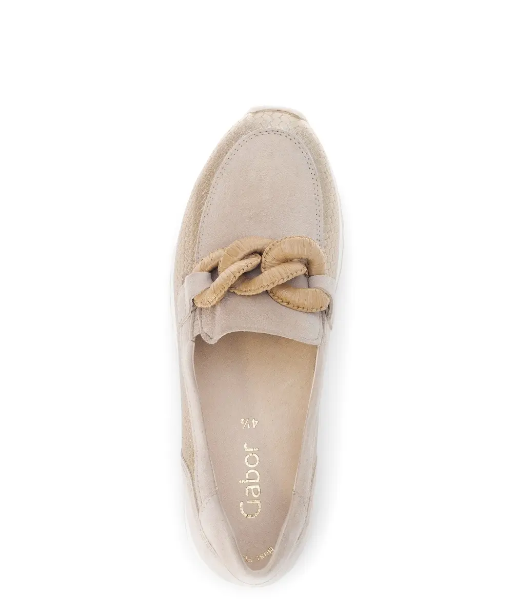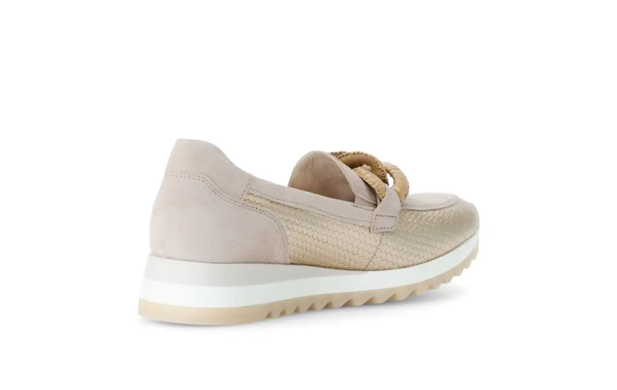 Deze stijlvolle Gabor instapper biedt ultiem comfort in een tijdloos design. Uitgevoerd in hoogwaardig beige nappaleer, voelt deze schoen heerlijk zacht aan en vormt hij zich perfect naar de voet. De opvallende grote schakel op de wreef voegt een modieus accent toe, terwijl de subtiele glans van het leer zorgt voor een luxe uitstraling. De lichte plateauzool met witte en beige details biedt niet alleen een trendy look, maar ook extra demping en grip voor optimaal loopcomfort.