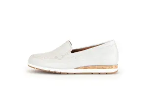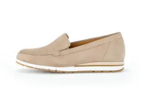 Deze beige mocassin van nubuck voelt zacht en soepel aan waardoor je meteen geniet van een natuurlijk draagcomfort. Het fijne nubuckleer vormt zich vlot naar je voet en geeft de mocassin een casual maar elegante uitstraling die perfect past bij dagelijkse momenten. De flexibele zool met subtiele sleehak zorgt voor een lichte demping zodat elke stap comfortabel aanvoelt en je zonder moeite langere tijd rondstapt. Dankzij het losse voetbed kan je eenvoudig je eigen inlegzolen gebruiken wat ideaal is wanneer je extra ondersteuning nodig hebt. De witte accentstreep in de zool geeft deze mocassin een sportieve en eigentijdse look waardoor je dit model zowel met een casual broek als een luchtige zomerjurk makkelijk combineert. Door de combinatie van zachte materialen en een moderne afwerking wordt deze mocassin een veelzijdige schoen waarop je elke dag kunt vertrouwen.