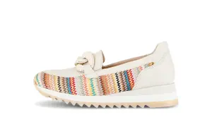 Deze beige mocassin van nappaleer van Gabor brengt comfort en stijl moeiteloos samen in een frisse, moderne schoen. Het zachte nappaleer voelt soepel aan en vormt zich mooi naar je voet, terwijl de decoratieve knoop op de wreef zorgt voor een elegante en vrouwelijke touch. Dankzij het losse voetbed kun je makkelijk je eigen inlegzolen gebruiken, wat handig is als je extra ondersteuning nodig hebt. De wijdte F (Best Fitting) geeft iets meer ruimte aan de voorvoet, waardoor deze mocassin ook na een lange dag aangenaam blijft zitten. De lichte en flexibele zool ondersteunt een natuurlijke afwikkeling van de voet, zodat je geniet van een comfortabel loopgevoel bij elk moment van de dag. Deze beige mocassin is een veelzijdige keuze voor vrouwen die een stijlvolle instapper zoeken met een zachte, moderne uitstraling.