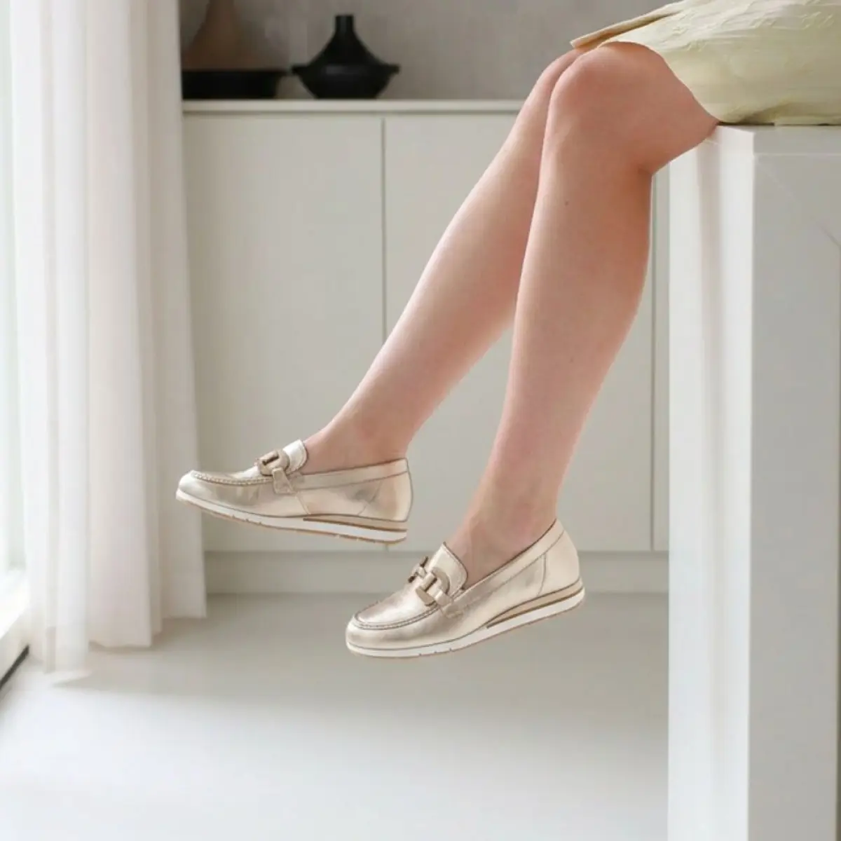 Deze goudkleurige loafer van nappaleer voelt zacht en soepel aan waardoor je meteen geniet van een luxueus draagcomfort. Het fijne nappaleer vormt zich mooi naar je voet en geeft de loafer een chique uitstraling die zowel bij casual outfits als bij geklede momenten past. De subtiele glans van het goud zorgt voor een elegante toets zonder te opvallend te worden waardoor je deze schoen vlot combineert met lichte zomerkledij, neutrale tinten of een stijlvolle broek. Dankzij de wijdte G krijgt je voet extra ruimte zodat ook een iets bredere voet comfortabel past. Het losse voetbed biedt ondersteuning en kan eenvoudig vervangen worden door je eigen inlegzolen wanneer je extra steun nodig hebt. Door de combinatie van draaggemak, stijlvolle details en een tijdloze kleur wordt deze loafer een veelzijdige keuze waarop je elke dag kunt vertrouwen.