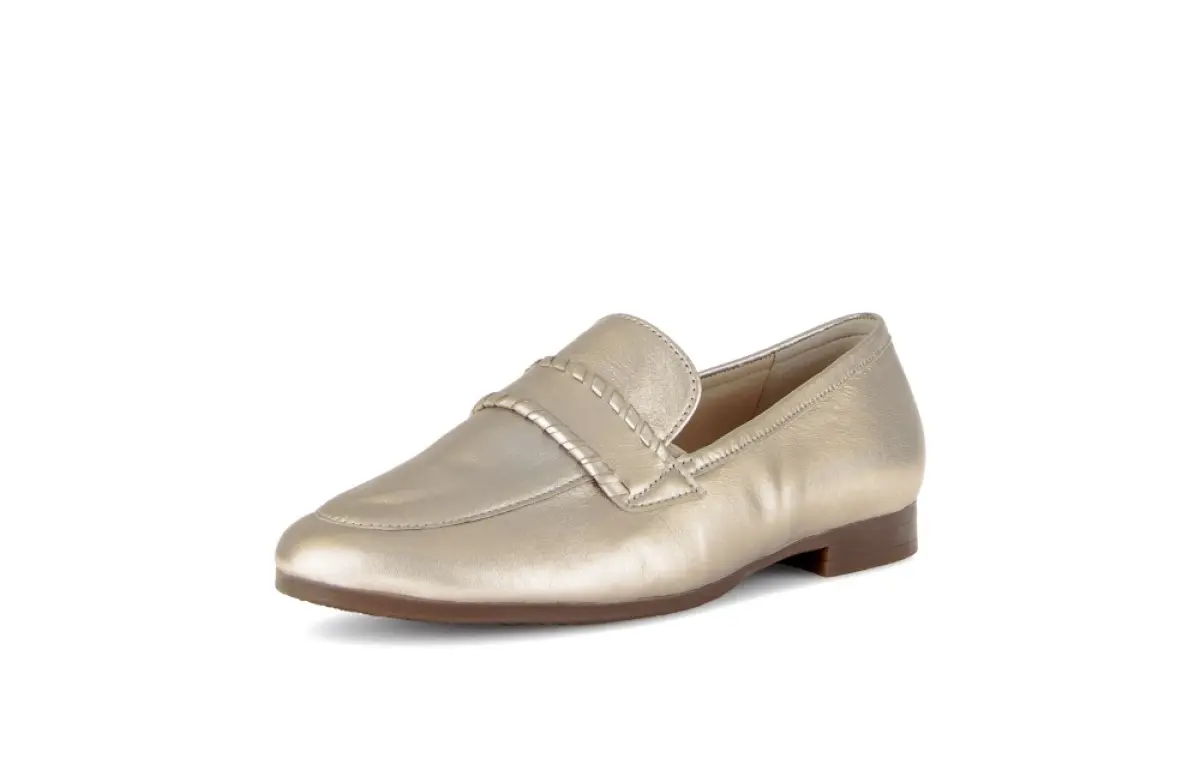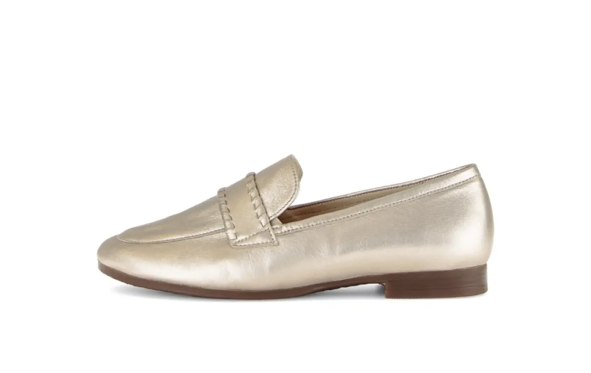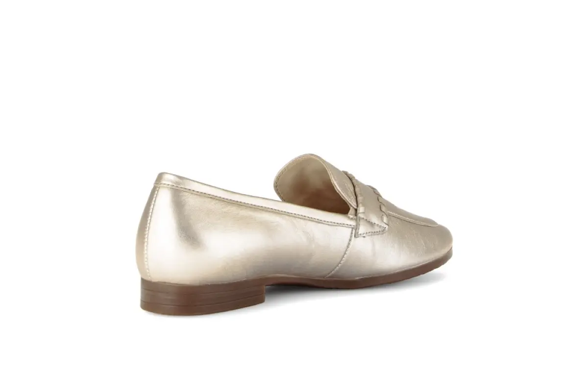 Deze goudkleurige mocassin van nappaleer voelt zacht en soepel aan waardoor je meteen geniet van een luxueus draagcomfort. Het fijne nappaleer vormt zich mooi naar je voet en geeft de mocassin een elegante uitstraling die zowel bij casual outfits als bij een geklede look past. Dankzij het losse voetbed ervaar je een prettige ondersteuning en kan je eenvoudig je eigen inlegzolen gebruiken wanneer je extra steun nodig hebt. De wijdte G biedt je voet extra ruimte zodat ook een iets bredere voet comfortabel en ontspannen aanvoelt. De lichte zool zorgt voor een zachte demping waardoor je deze mocassin ook tijdens langere dagen comfortabel blijft dragen. Door de combinatie van klasse, gemak en hoogwaardige materialen wordt dit een veelzijdige schoen die je look op een stijlvolle manier afwerkt.