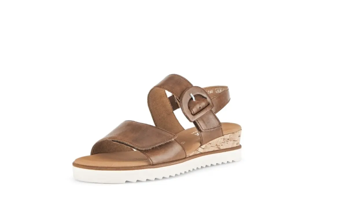 Deze bruine sandaal van nappaleer voelt zacht en soepel aan waardoor je meteen geniet van een comfortabel zomers draaggevoel. De brede leren banden omsluiten je voet op een prettige manier en geven de sandaal een elegante en natuurlijke uitstraling. De grote ronde gesp voegt een modieuze toets toe en laat je de pasvorm eenvoudig afstellen zodat de sandaal stevig en comfortabel blijft zitten. Dankzij het vaste voetbed ervaar je bij elke stap een aangename ondersteuning terwijl de wijdte G je voet extra ruimte biedt waardoor de pasvorm ontspannen en luchtig blijft. De lichte sleehak met kurklook geeft het ontwerp een subtiele hoogte en een zomerse uitstraling. Door de combinatie van zachte materialen, een tijdloze bruine tint en een comfortabele afwerking wordt dit een veelzijdige sandaal die je moeiteloos combineert met een linnen jurk, een korte broek of een luchtige blouse voor een stijlvolle zomerse look.