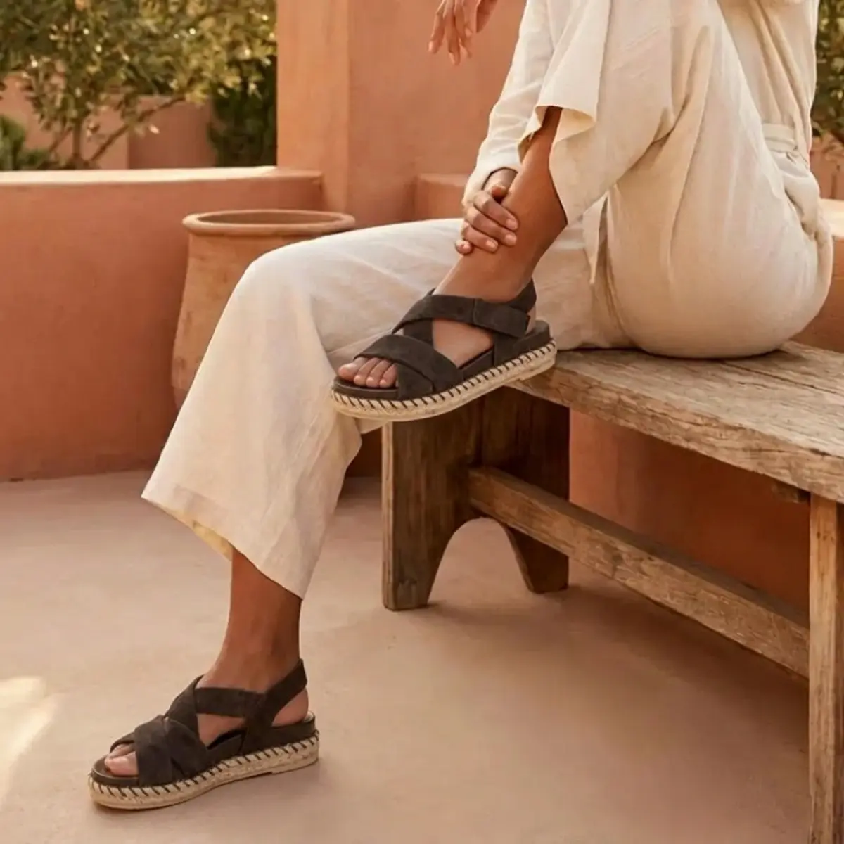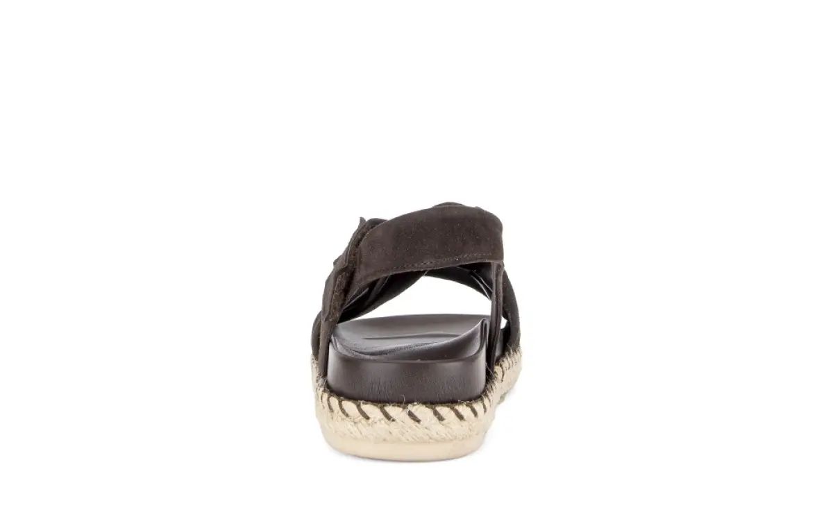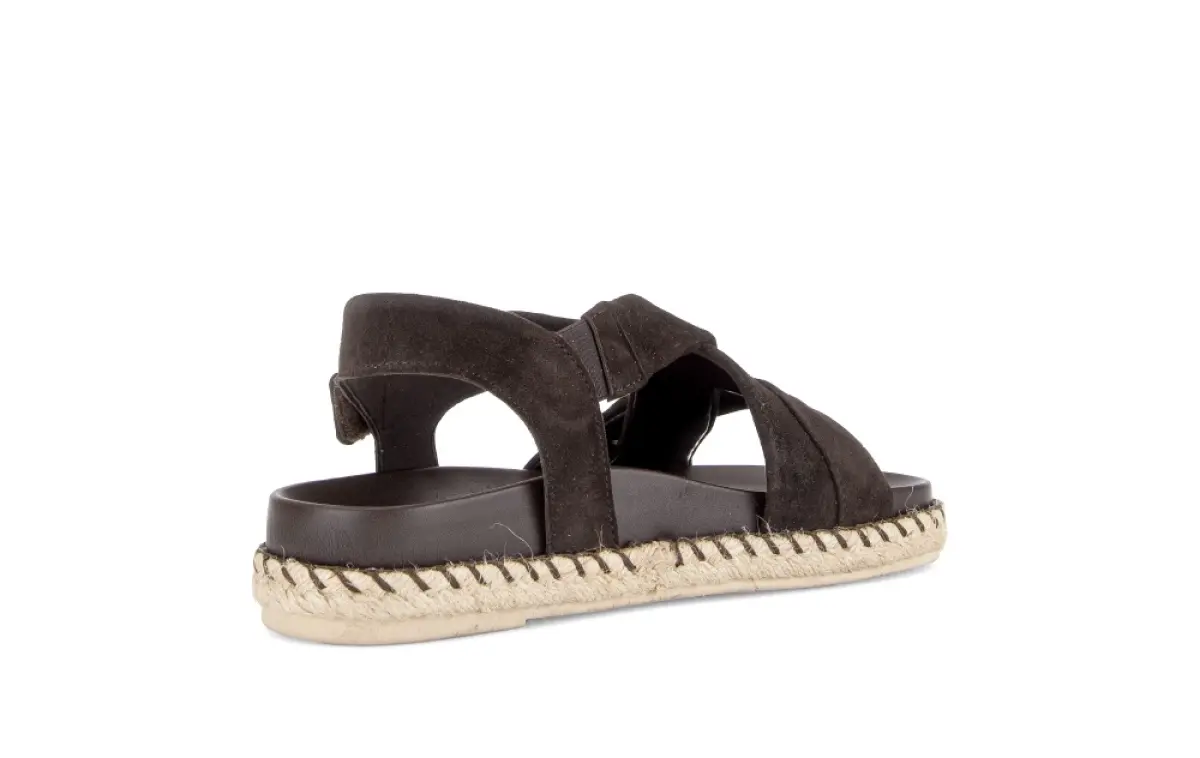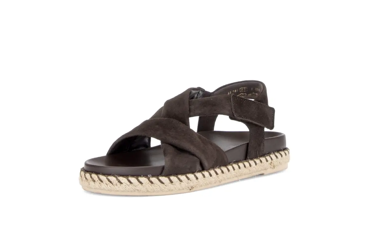 Deze stijlvolle Gabor sandaal van donkerbruin suède combineert comfort met een natuurlijke, zomerse elegantie. De brede, gekruiste banden van zacht suède omsluiten je voet op een aangename manier en geven de sandaal een vrouwelijke en verfijnde look. Dankzij de klittenbandsluiting rond de enkel pas je de pasvorm snel en makkelijk aan. De Best Fitting wijdte F biedt iets meer ruimte bij de voorvoet, waardoor je ook op warme dagen ontspannen blijft lopen. Het vaste voetbed ondersteunt je voet en voelt zacht aan bij elke stap. De gevlochten touwzool met espadrille-accent geeft deze sandaal een frisse zomerse uitstraling die perfect past bij een linnen broek, een luchtige jurk of een casual short. Deze donkerbruine sandaal is een comfortabele en stijlvolle keuze voor elke zomerdag.