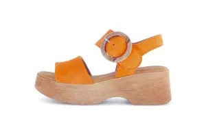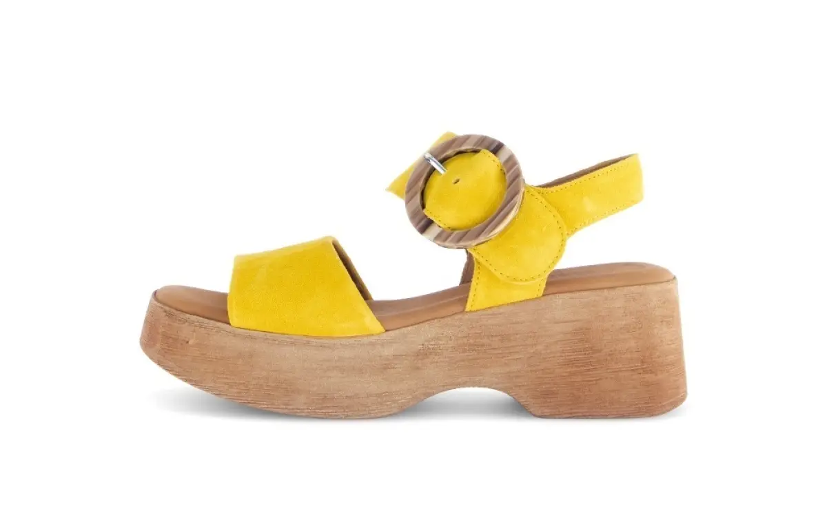 Breng een zonnige flair naar je zomergarderobe met deze gele suède sandalen van Gabor. Het zachte suède in een levendige tint zorgt voor een vrolijke en moderne uitstraling. De grote ronde gesp voegt een speels detail toe en zorgt voor een verstelbare pasvorm. De houten plateauzool geeft een trendy retro vibe en biedt comfort en stabiliteit.