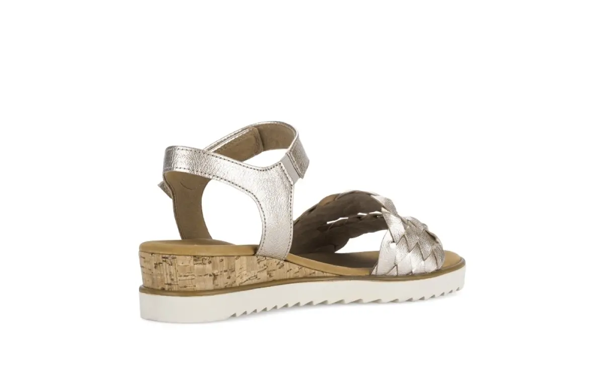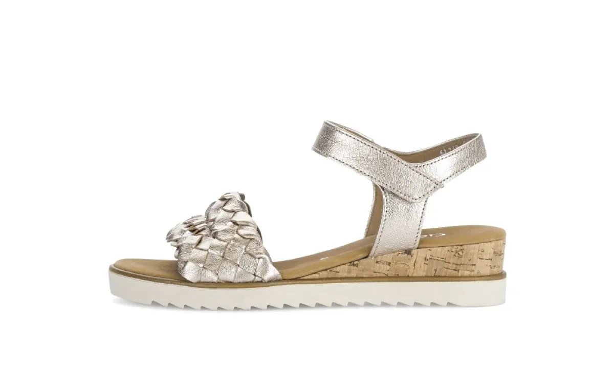 Deze goudkleurige sandaal van nappaleer voelt zacht en luxueus aan waardoor je meteen geniet van een elegant en comfortabel draaggevoel. De brede gevlochten band over de voorvoet geeft de sandaal een speels maar toch verfijnd accent dat je zomerse outfit een stijlvolle boost geeft. Dankzij het vaste voetbed ervaar je de hele dag door een prettige ondersteuning, terwijl de wijdte G extra ruimte biedt voor een ontspannen pasvorm die ideaal is op warme dagen. De subtiele sleehak met kurklook geeft het ontwerp een natuurlijke en luchtige touch en zorgt tegelijk voor een lichte hoogte zonder aan stabiliteit in te boeten. De lichte profielzool biedt goede grip en maakt het geheel modern en zomers. Zo wordt dit een veelzijdige sandaal die luxe, comfort en elegantie moeiteloos samenbrengt.