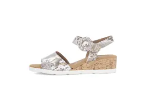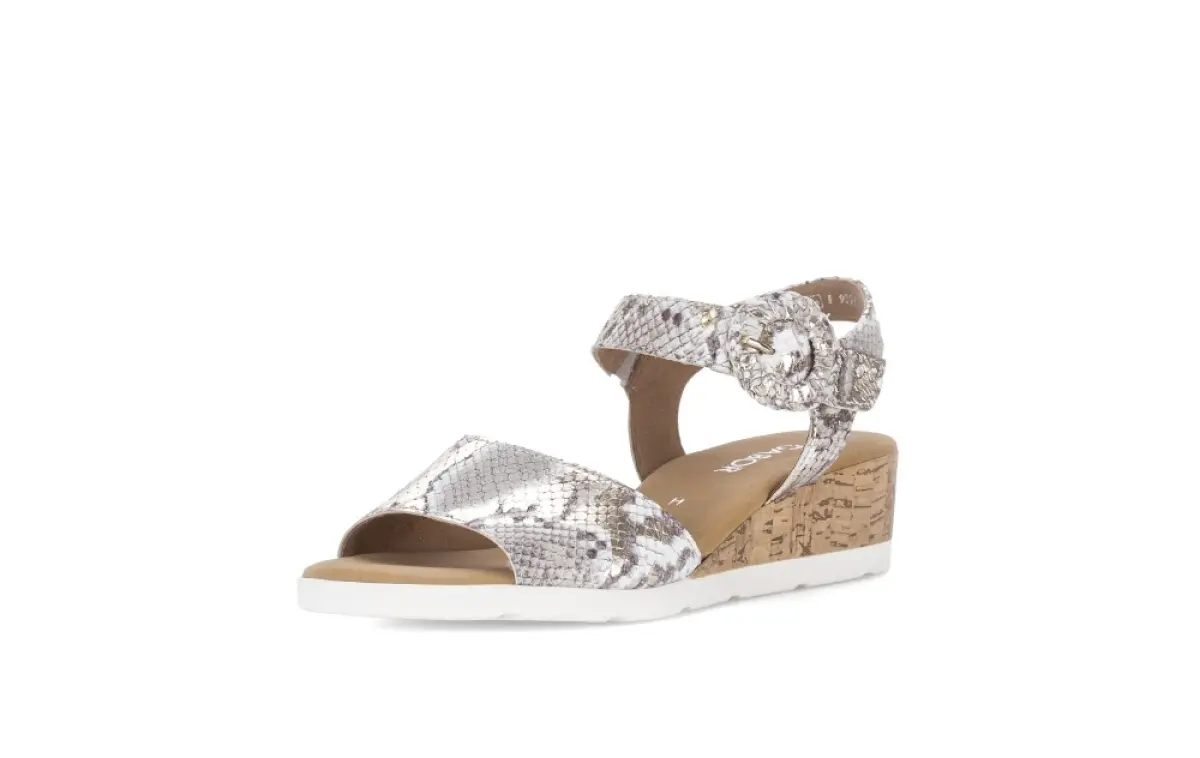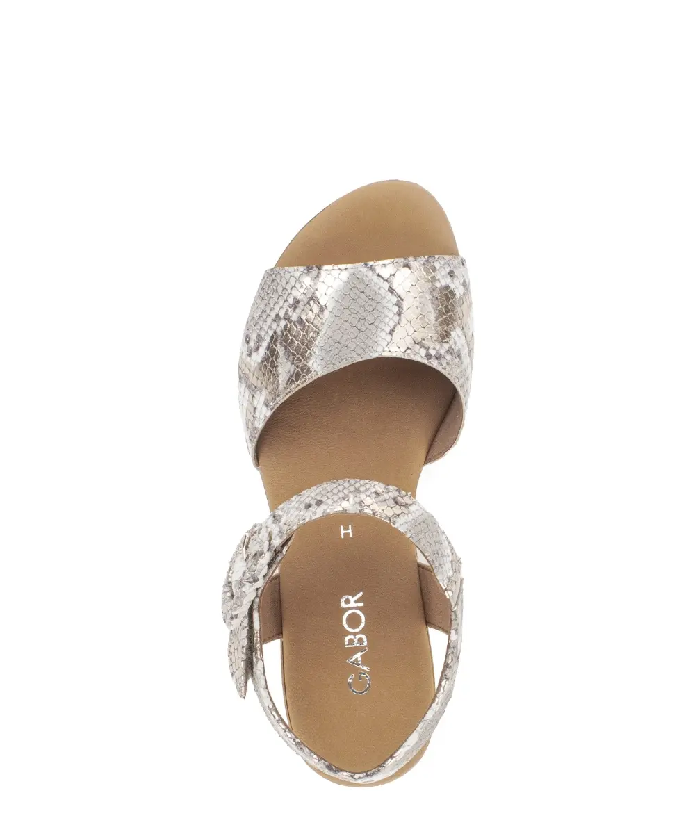 Deze sandaal van goudkleurige slangenprint voelt zacht en luxueus aan waardoor je meteen geniet van een elegante en comfortabele zomerse look. Het fijne reliëf en de subtiele glans geven de sandaal een chique uitstraling die je outfit moeiteloos naar een hoger niveau tilt. De brede band over de wreef sluit prettig rond je voet, terwijl de ronde gesp op de enkelband een modieuze toets toevoegt en de pasvorm makkelijk verstelbaar maakt. Dankzij het vaste voetbed krijg je bij elke stap een stabiele ondersteuning zodat je deze sandaal de hele dag door comfortabel draagt. De wijdte H biedt extra ruimte voor een soepele en ontspannen pasvorm, ideaal voor wie net dat beetje extra comfort zoekt. De goudtint met slangenprint laat zich eenvoudig combineren met neutrale tinten of een zomerse jurk en geeft elke outfit een verfijnde, modieuze touch.