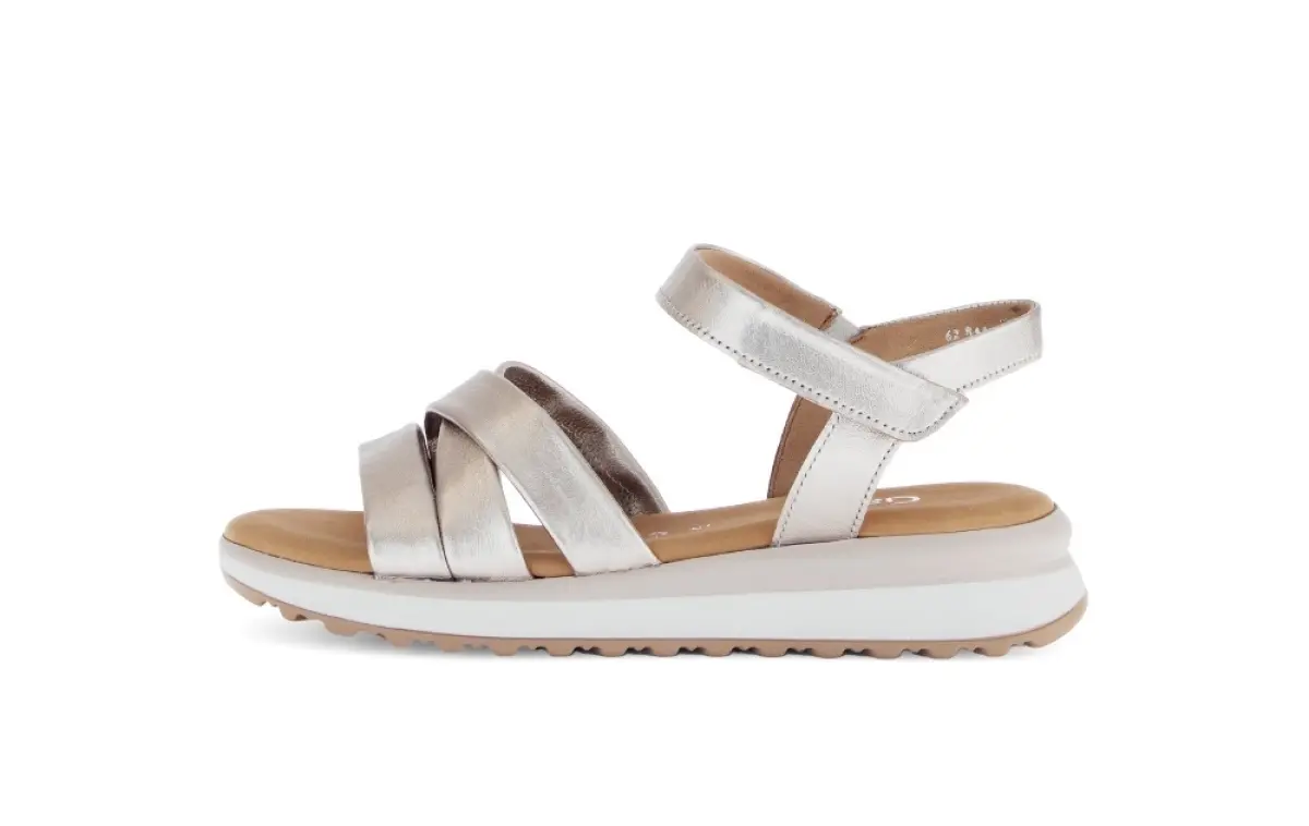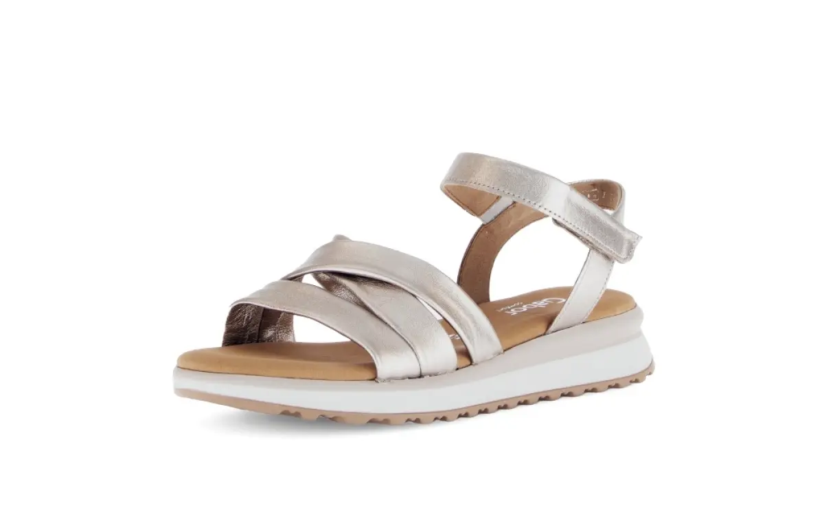 Deze sandaal van goudkleurig nappaleer van Gabor combineert elegantie met het dagelijkse comfort dat je zoekt tijdens warme zomerdagen. Het zachte nappaleer voelt aangenaam aan en sluit mooi aan rond je voet, terwijl het vaste voetbed voor een stabiele en ondersteunende pasvorm zorgt. Dankzij de wijdte G heb je net dat beetje extra ruimte, zodat je voeten ontspannen kunnen bewegen, zelfs op drukkere dagen. De verfijnde kruisbanden geven de sandaal een vrouwelijke look, en dankzij de klittenbandsluiting rond de enkel stem je de pasvorm makkelijk af op wat jij prettig vindt. De subtiele goudkleurige glans voegt een chique toets toe en laat zich moeiteloos combineren met lichte zomertinten of een feestelijke outfit.
