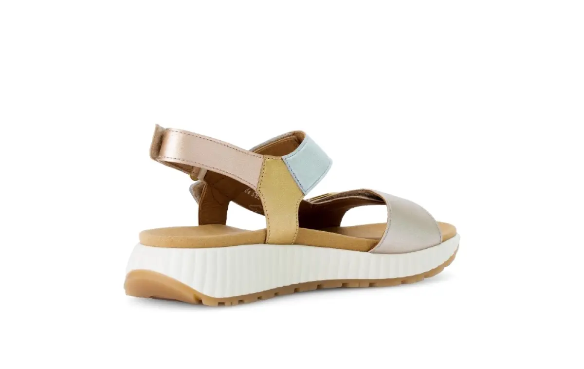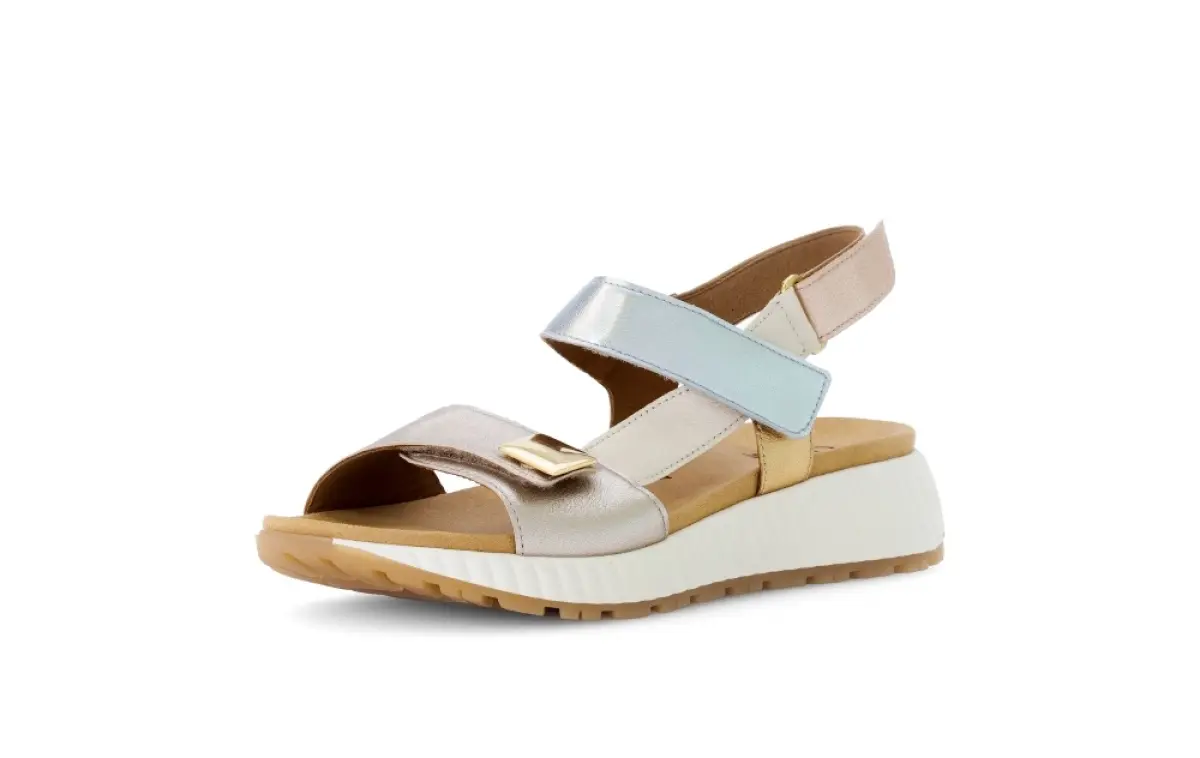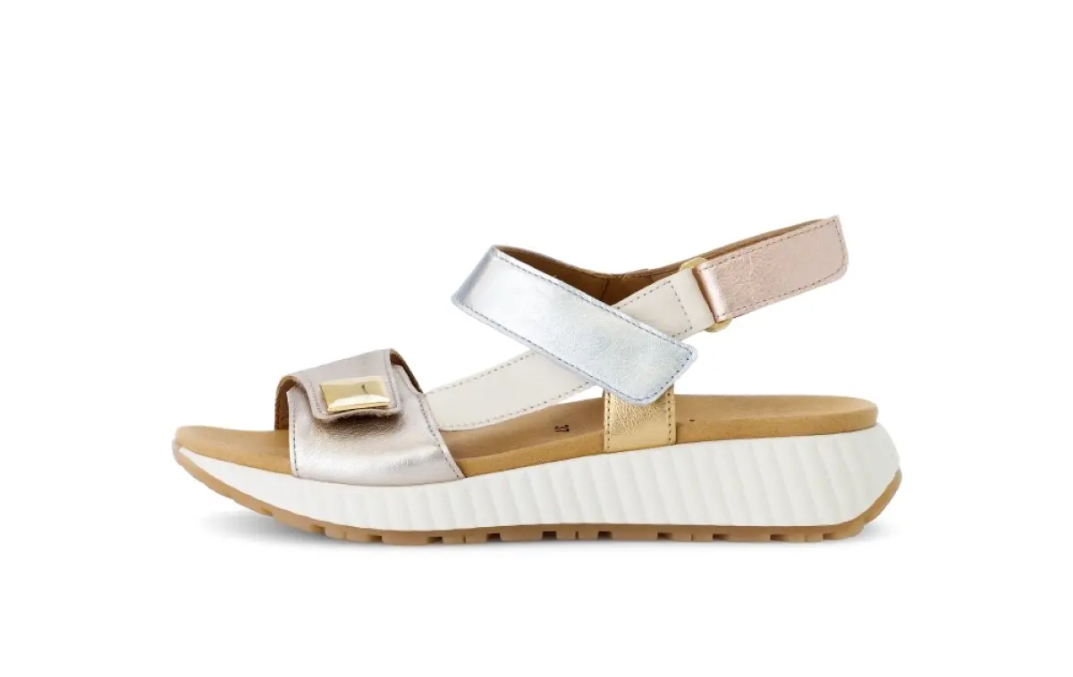 Deze Gabor sandaal van goudkleurig nappaleer straalt moderne elegantie uit en voelt meteen comfortabel aan. De metallic tinten in goud, zilver en rosé geven de sandaal een frisse en stijlvolle uitstraling die perfect past bij zomerse outfits. De verstelbare klittenbandsluitingen maken het eenvoudig om de pasvorm precies goed te zetten, terwijl de Best Fitting wijdte F extra ruimte biedt bij de voorvoet. Dat zorgt voor meer ontspanning, ook tijdens warme dagen. Het vaste voetbed is zacht gevoerd en ondersteunt je voet op een natuurlijke manier, zodat je moeiteloos en comfortabel blijft stappen. De subtiele metallic glans maakt deze sandaal geschikt voor zowel een casual daglook als een elegante avondoutfit.