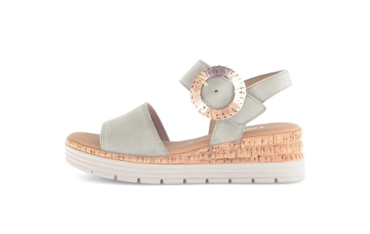 Deze lichtgroene suède sandalen van Gabor zijn een stijlvolle keuze voor de zomer. Het zachte suède geeft een verfijnde uitstraling, terwijl de opvallende decoratieve gesp in metallic kleuren een uniek detail toevoegt. De sleehak met kurkaccenten en de lichte zool zorgen voor een trendy en luchtige look, gecombineerd met ultiem draagcomfort.
