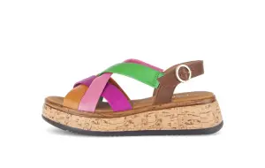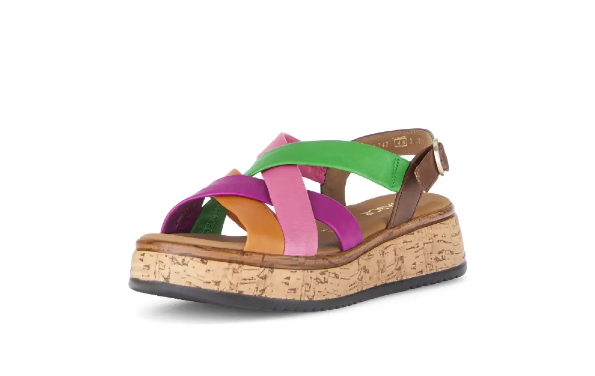 Deze kleurrijke sandaal van nappaleer voelt zacht en soepel aan waardoor je meteen geniet van een comfortabel en zomers draaggevoel. De levendige bandjes in roze, groen, oranje en bruin geven de sandaal een speelse en modieuze uitstraling die elke outfit laat opvallen. Dankzij het vaste voetbed ervaar je bij elke stap een fijne ondersteuning zodat je deze sandaal moeiteloos de hele dag draagt. De wijdte G biedt je voet extra ruimte waardoor de pasvorm ontspannen en aangenaam blijft, ook op warme dagen. De kurklookzool met lichte verhoging zorgt voor een natuurlijke en trendy look en biedt tegelijk een zachte demping die het loopcomfort verhoogt. Door de combinatie van opvallende kleuren, zachte materialen en een moderne plateauzool wordt dit een ideale sandaal voor wie graag een frisse en eigentijdse zomerse stijl combineert met het betrouwbare draagcomfort van Gabor.