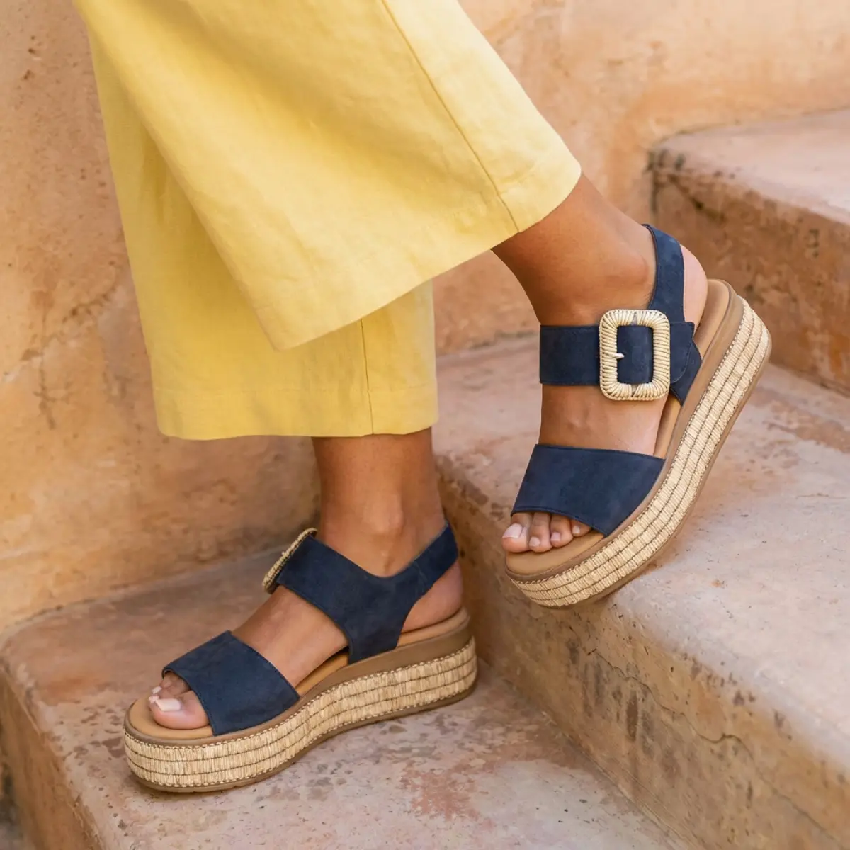 Deze Gabor sandaal van nachtblauw velours straalt zomerse elegantie uit en voelt meteen comfortabel aan. De zachte velours band sluit soepel aan op je voet en geeft het model een luxueuze uitstraling. De brede enkelband met grote, gevlochten gesp zorgt voor een modieuze toets en laat je de pasvorm makkelijk aanpassen. Dankzij de Best Fitting wijdte F krijg je bij de voorvoet wat extra ruimte, zodat je voeten ook op warme dagen ontspannen blijven. Het vaste voetbed biedt zachte ondersteuning en stabiliteit bij elke stap. De plateauzool met subtiele raffia-accenten geeft de sandaal een natuurlijke, zomerse look en zorgt tegelijk voor lichtheid en demping. De diepe nachtblauwe kleur past prachtig bij wit, beige of denim en geeft je zomeroutfits een stijlvolle, elegante twist.