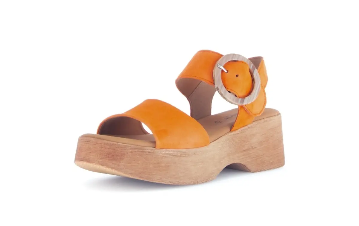 Deze Gabor plateau sandalen in oranje zijn een echte eyecatcher. Het zachte suède voelt luxe aan, terwijl de robuuste houten look zool zorgt voor een trendy retro-uitstraling. De brede band en de opvallende ronde gesp geven een speelse twist en zorgen voor een perfecte pasvorm. Dankzij de stabiele hak loop je moeiteloos de hele dag door. Combineer deze sandalen met een maxi-jurk voor een boho-chique look of draag ze onder een jeans voor een zomerse touch. Een stijlvolle keuze voor wie houdt van comfort en een opvallende, modieuze uitstraling.