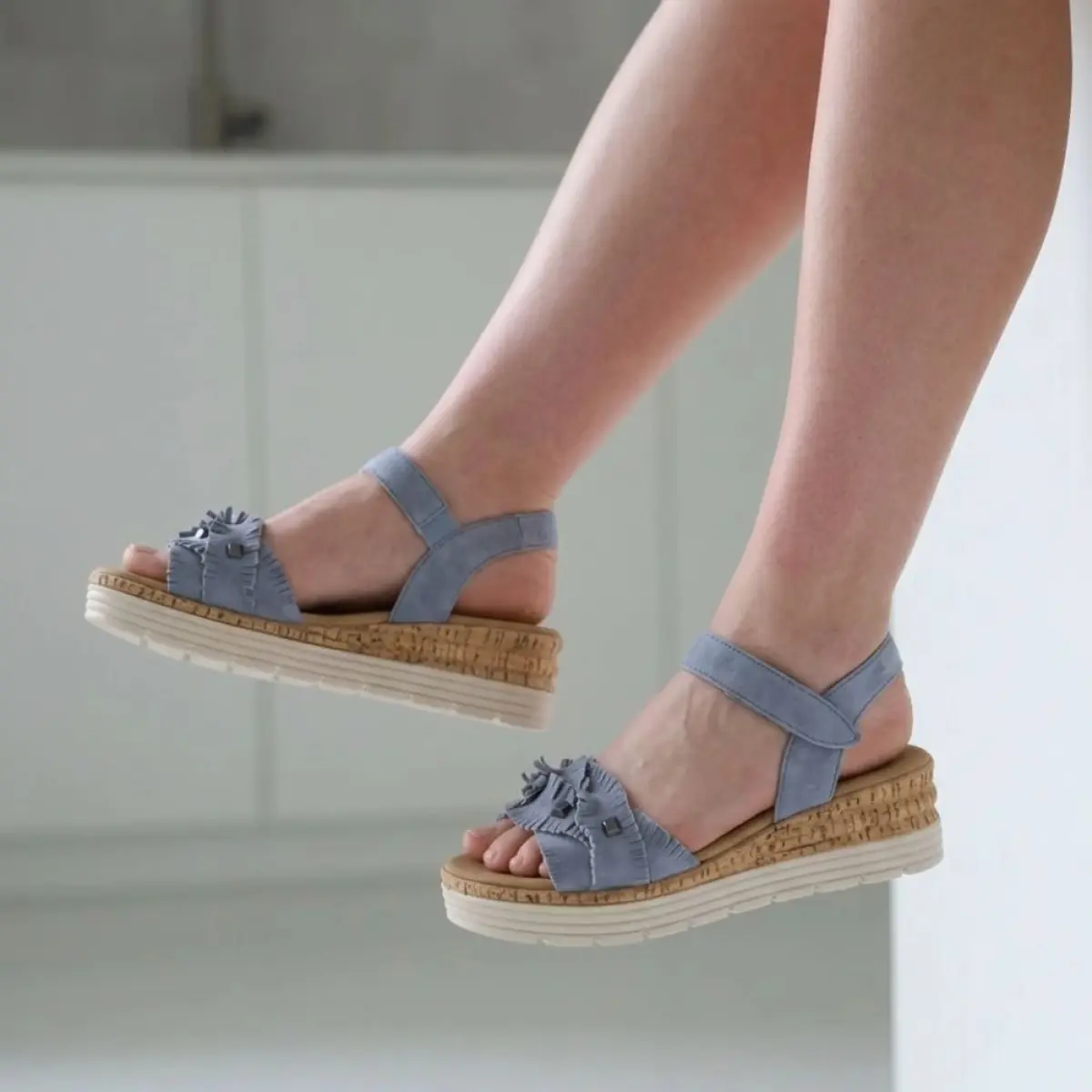 Deze lichtblauwe sandaal van suède voelt zacht en soepel aan waardoor je meteen geniet van een comfortabel en zomers draaggevoel. Het fijne suède vormt zich mooi naar je voet en de decoratieve franjes op de voorzijde geven de sandaal een speelse en verfijnde uitstraling die perfect past bij warme dagen. Dankzij het vaste voetbed krijg je bij elke stap een stabiele ondersteuning terwijl de lichte plateauzool met kurklook zorgt voor extra demping en een moderne, frisse toets toevoegt. De wijdte G biedt je voet voldoende ruimte zodat de pasvorm ontspannen en comfortabel blijft ook wanneer je langer onderweg bent. Door de combinatie van zachte materialen, een luchtige structuur en een vrolijke lichtblauwe tint wordt dit een ideale sandaal voor een modieuze en comfortabele look tijdens zonnige momenten.
