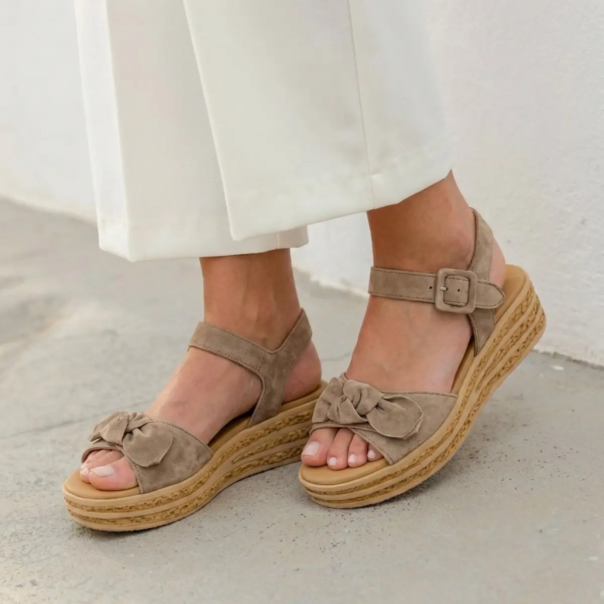 Deze Gabor sandaal van taupe suède straalt natuurlijke elegantie uit met een speelse, vrouwelijke toets. De zachte suède band over de wreef is afgewerkt met een subtiele knoop die het ontwerp een verfijnde look geeft. De klittenbandsluiting zorgt voor een optimale, verstelbare pasvorm. Dankzij de wijdte F (Best Fitting) krijgt je voorvoet wat extra ruimte, waardoor deze sandaal ook op warme dagen comfortabel blijft. Het vaste voetbed ondersteunt je voet op een zachte, natuurlijke manier en maakt elke stap aangenaam. De lichte sleehak met kurklook zorgt voor stabiliteit en fijne demping, terwijl ze de sandaal tegelijk een moderne uitstraling geeft. Deze taupekleurige sandaal past prachtig bij natuurlijke tinten en zomerse outfits.
