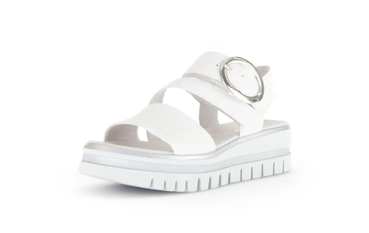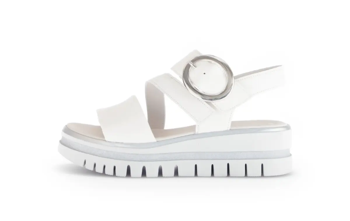 Deze witte sandalen van Gabor zijn een perfecte balans tussen modern design en ultiem comfort. Gemaakt van soepel nappaleer bieden ze een luxueuze uitstraling en een zachte touch. De opvallende zilveren ronde gesp voegt een eigentijdse twist toe en zorgt voor een verstelbare pasvorm. De tweekleurige zool met subtiele metallic accenten biedt niet alleen een trendy look, maar ook uitstekende demping voor langdurig draagplezier.
