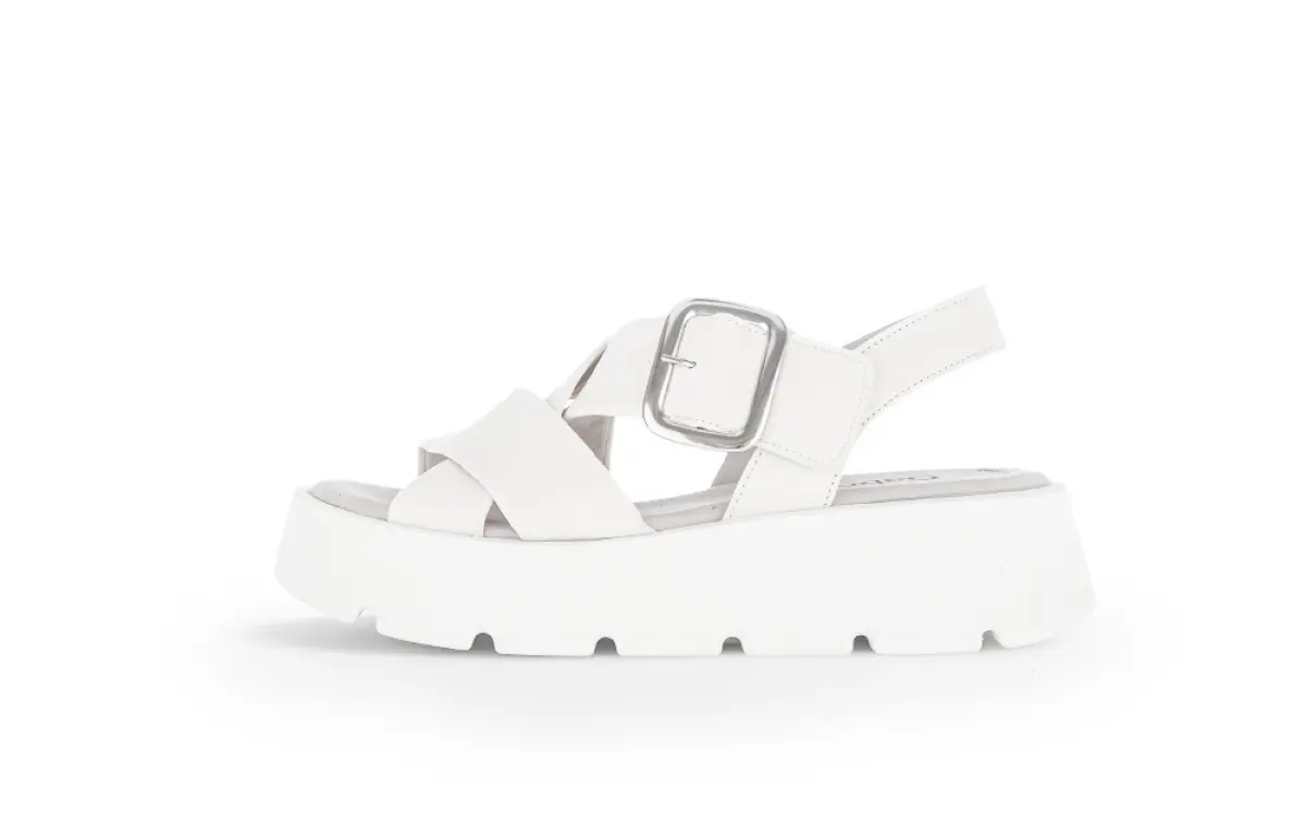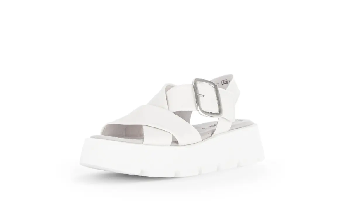 Deze witte sandalen van Gabor zijn de perfecte mix van minimalistische elegantie en maximaal comfort. Het nappaleer voelt zacht aan en geeft een luxe uitstraling. De gekruiste bandjes en zilveren gesp zorgen voor een verfijnd design, terwijl de verstelbare sluiting garant staat voor een optimale pasvorm. De witte chunky zool biedt niet alleen een trendy look, maar ook uitstekende ondersteuning voor langdurig draagplezier.