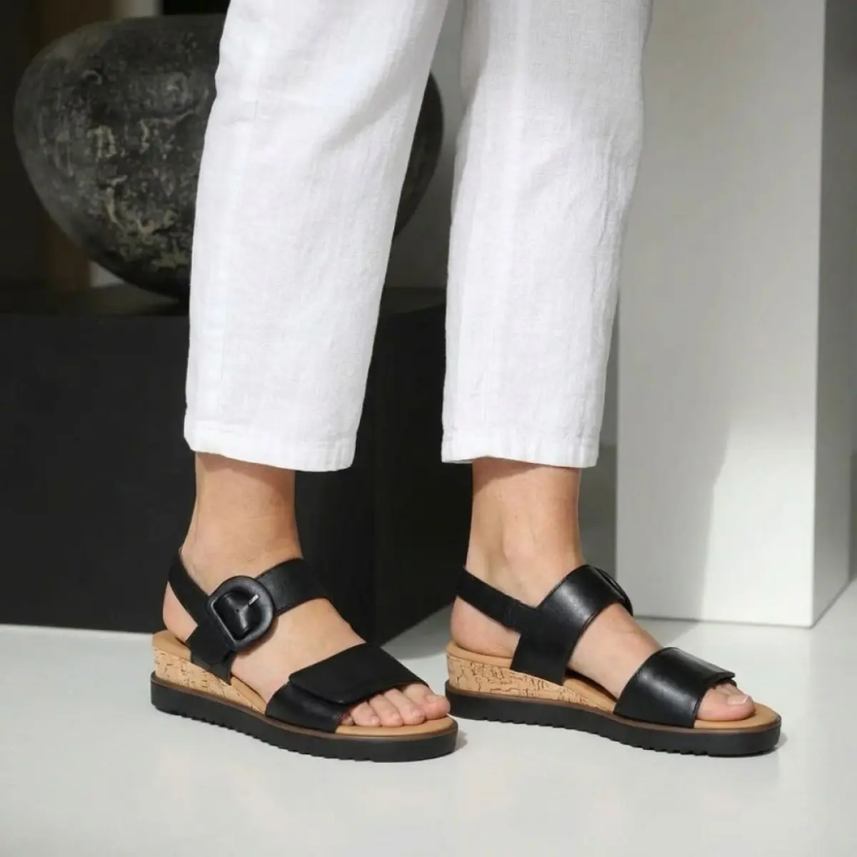 Deze zwarte sandaal van nappaleer voelt zacht en soepel aan waardoor je meteen geniet van comfortabel dagelijks draaggemak. Met de handige klittenbandsluitingen trek je de sandaal gemakkelijk aan en pas je de pasvorm moeiteloos aan. Dankzij het vaste voetbed ervaar je bij elke stap een fijne ondersteuning, terwijl de wijdte G je voet extra ruimte geeft voor een ontspannen en luchtige pasvorm, ideaal op warme dagen. De kurklook sleehak geeft de sandaal een natuurlijke en stijlvolle look en zorgt tegelijk voor een subtiele hoogte zonder in te leveren op stabiliteit. Door de combinatie van zachte materialen, een verstelbare pasvorm en een tijdloze zwarte tint wordt dit een veelzijdige sandaal die stijl en comfort moeiteloos samenbrengt.