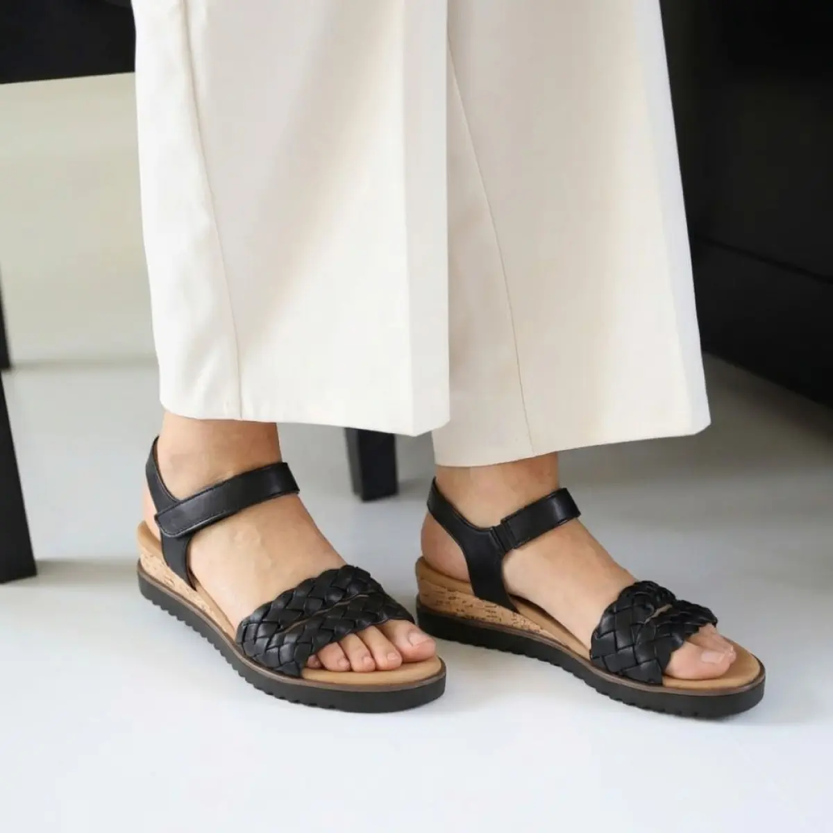 Deze zwarte sandaal van kalfsleer voelt zacht en stevig aan waardoor je meteen kunt rekenen op comfort en een stijlvolle uitstraling. De brede gevlochten band over de voorvoet geeft de sandaal een luxueuze, trendy look en vormt een elegant contrast met de strakke lijnen van de enkelband. Het vaste voetbed biedt een aangename ondersteuning bij elke stap en maakt deze sandaal ideaal voor lange zomerdagen. De wijdte G geeft je voet extra ruimte waardoor de pasvorm ontspannen en comfortabel blijft, ook bij warm weer. De kurklook sleehak zorgt voor een natuurlijke, luchtige toets en geeft een subtiele hoogte zonder in te boeten op stabiliteit. De zwarte profielzool biedt stevige grip en maakt het geheel modern en veelzijdig. Zo wordt dit een stijlvolle sandaal die je moeiteloos combineert met zowel een luchtige jurk als een elegante zomerbroek.