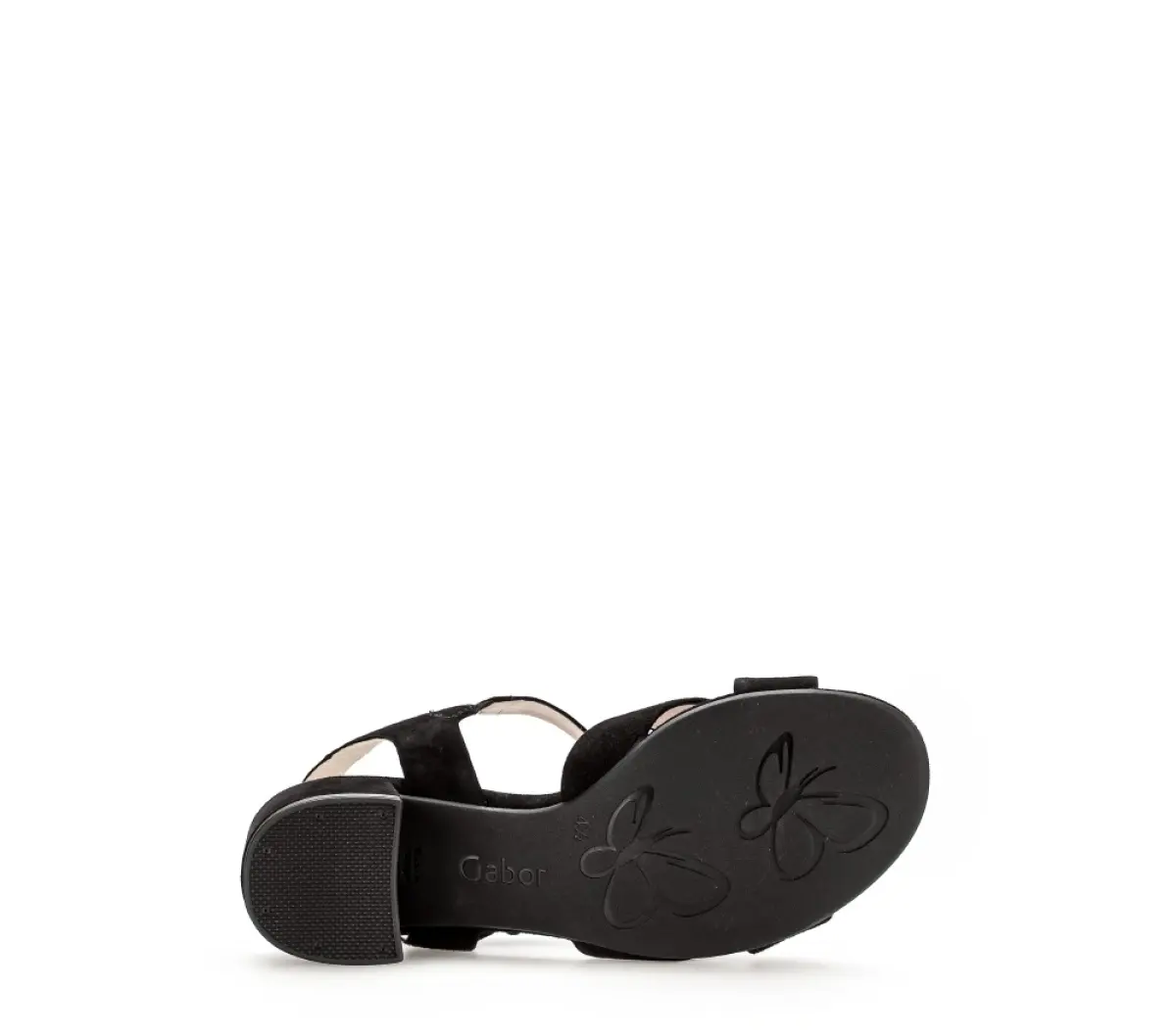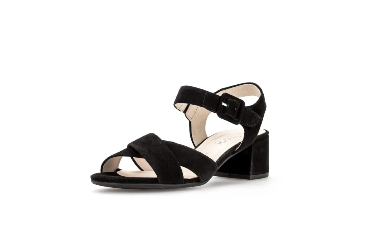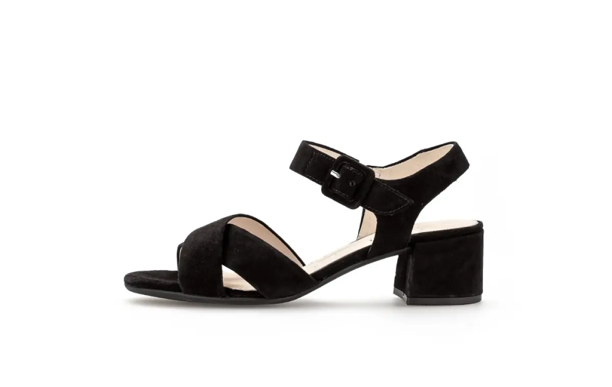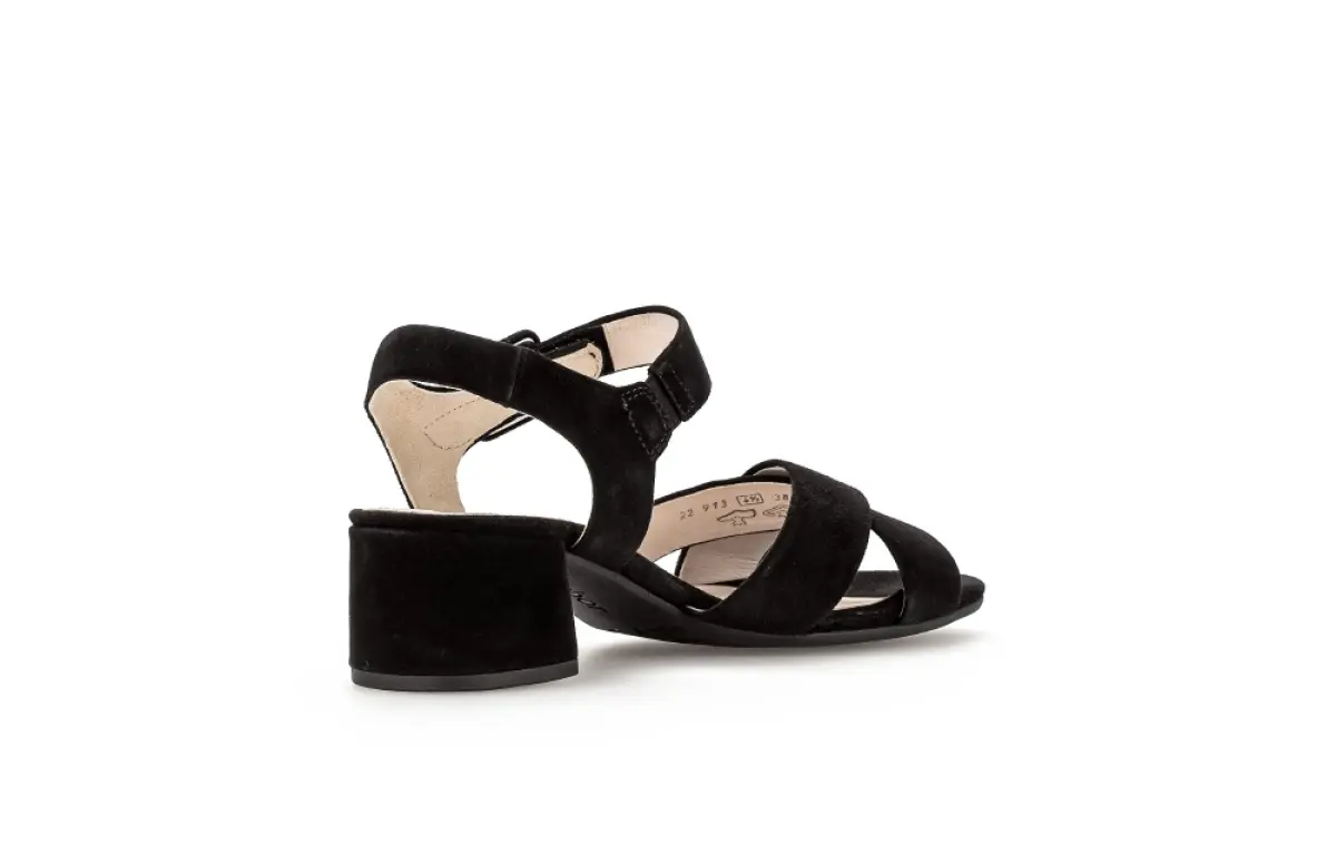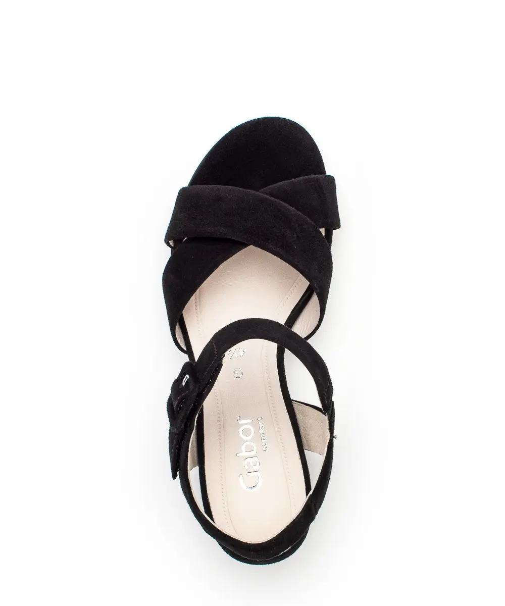 Deze sandaal van zwart suède van Gabor is een elegante keuze voor wie comfort en stijl wil combineren op warme dagen. Het zachte suède voelt prettig aan en geeft de sandaal een chique en tijdloze uitstraling, terwijl het vaste voetbed zorgt voor een stabiele ondersteuning bij elke stap. Dankzij de wijdte G geniet je van een iets ruimere pasvorm, wat ideaal is wanneer je voeten wat meer ruimte nodig hebben of wanneer je de sandaal langer draagt. De brede gekruiste banden omsluiten je voet stevig en geven het ontwerp een verfijnde look. De enkelband met gesp maakt de pasvorm makkelijk verstelbaar en zorgt ervoor dat de sandaal mooi aansluit rond je voet. De zwarte kleur maakt dit model bijzonder veelzijdig, zodat je het moeiteloos draagt bij een zomerse outfit of een meer geklede gelegenheid.