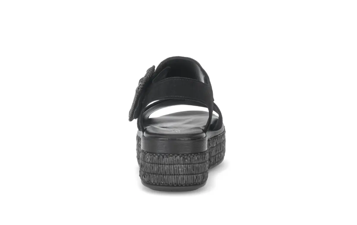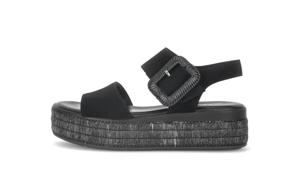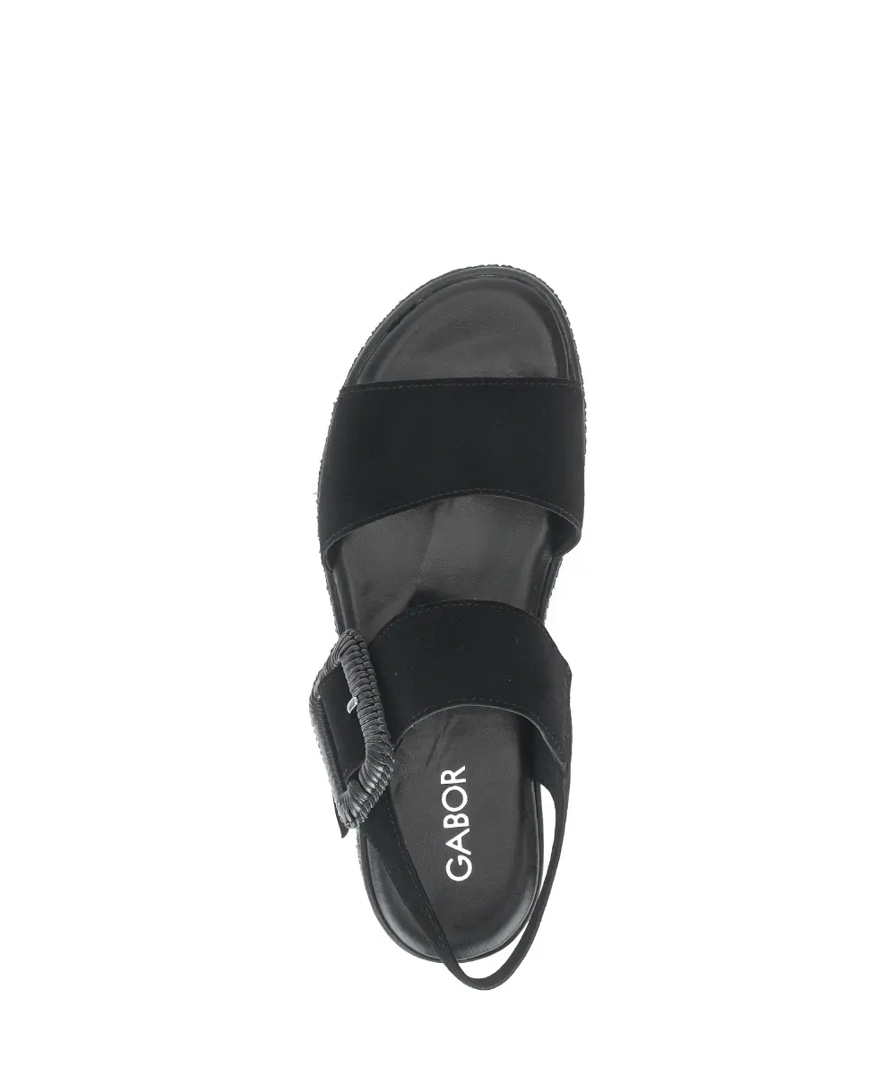 Deze Gabor sandaal van zwart suède combineert moderne elegantie met het vertrouwde comfort van Gabor. De zachte suède band voelt soepel aan en geeft de sandaal een luxueuze uitstraling. De brede enkelband met grote, gevlochten gesp vormt een stijlvol detail en maakt de pasvorm eenvoudig verstelbaar. Dankzij de Best Fitting wijdte F krijg je bij de voorvoet wat extra ruimte, waardoor de sandaal ook tijdens warme dagen comfortabel blijft. Het vaste voetbed ondersteunt je voet op een natuurlijke manier en zorgt voor zachte demping bij elke stap. De zwarte plateauzool met subtiel raffia-effect geeft het model een krachtige, moderne look en biedt tegelijk stabiliteit en licht loopcomfort. Deze sandaal past moeiteloos bij zowel casual zomerlooks als meer elegante outfits.