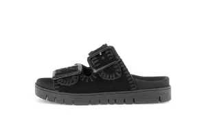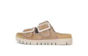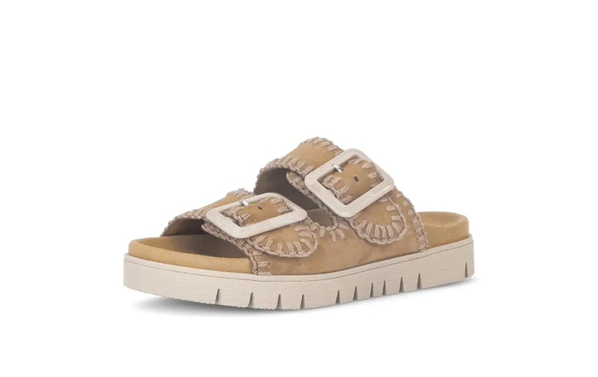 Deze Gabor muil van beige suède is een comfortabele en stijlvolle keuze voor warme dagen. Het zachte suède voelt soepel aan en de fijne stiksels geven de slipper een ambachtelijke, modieuze uitstraling. De twee verstelbare klittenbandjes maken het makkelijk om de pasvorm perfect af te stemmen op je voet, zodat je altijd de juiste steun hebt. Het vaste voetbed biedt stabiliteit en zorgt ervoor dat je ook na langere tijd prettig blijft stappen. Dankzij de wijdte F (Best Fitting) heb je iets meer ruimte bij de voorvoet, wat het draagcomfort merkbaar verhoogt. De lichte zool met een subtiele verhoging geeft de slipper een moderne look en biedt tegelijk extra demping bij elke stap. Een ideale keuze voor casual outfits die je graag een stijlvolle twist geeft.