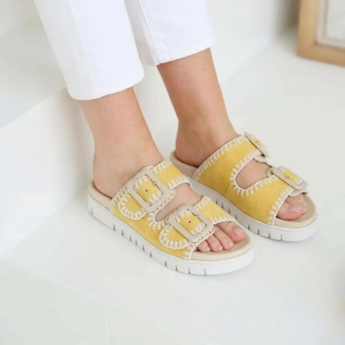 Deze Gabor muil van geel suède is een frisse en zomerse keuze die comfort en stijl mooi samenbrengt. Het zachte suède voelt soepel aan en de fijne stikdetails geven de slipper een verfijnde, opvallende look. Dankzij de twee verstelbare klittenbandjes stem je de pasvorm makkelijk af op je voet, zodat je altijd stevige steun hebt. Het vaste voetbed zorgt voor stabiel loopcomfort, ideaal voor warme dagen waarop je veel buiten bent. De wijdte F (Best Fitting) biedt iets meer ruimte bij de voorvoet, waardoor de slipper ook na langere tijd aangenaam blijft zitten. De zonnige geeltint geeft elke outfit een vrolijke, moderne touch en maakt deze slipper perfect voor dagelijks zomers gebruik.