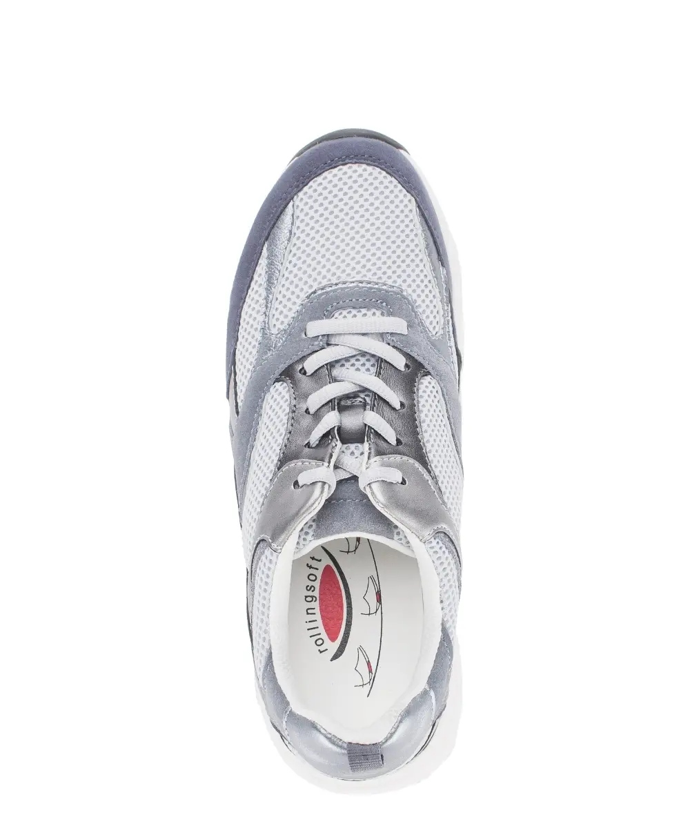 Deze blauwe Gabor basket van suède heeft een moderne uitstraling en biedt het comfort dat je van Gabor gewend bent. Het zachte suède in de kleur sky voelt soepel aan en wordt gecombineerd met ademend mesh, waardoor de schoen licht en luchtig aanvoelt tijdens het dragen. Het losse voetbed zorgt voor extra comfort en maakt het mogelijk om eigen inlegzolen te gebruiken. De sportieve zool met subtiele hoogte biedt optimale demping en stabiliteit, ideaal voor dagelijks gebruik. Met wijdte G heeft deze basket een fijne pasvorm die geschikt is voor de normale voetbreedte. De elegante blauwe tint en metallic accenten geven deze basket een stijlvolle en eigentijdse look die moeiteloos combineert met zowel een casual jeans als een zomerse outfit.
