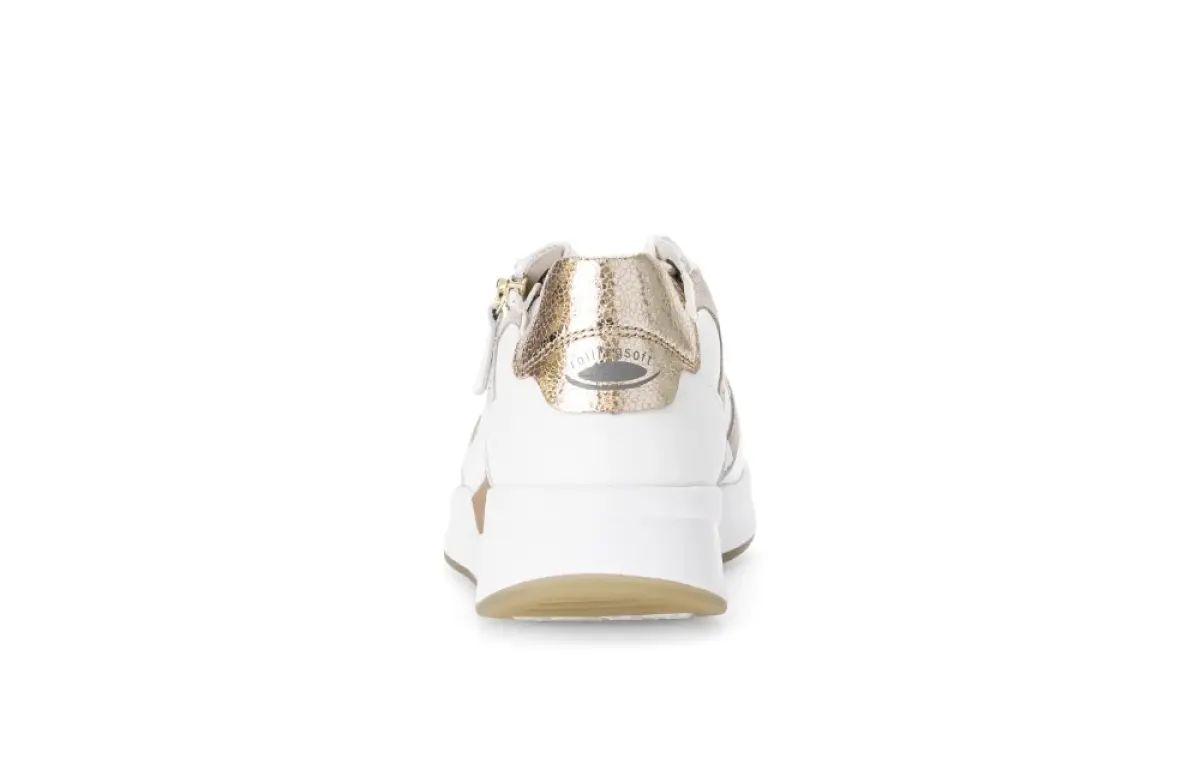 Deze witte Gabor sneaker van kalfsleer is een moderne klassieker met een sportieve uitstraling. Het gladde kalfsleer voelt soepel aan en krijgt dankzij de zachte beige accenten en de subtiele metallic hiel een frisse, stijlvolle look die moeiteloos te combineren is. Het losse voetbed biedt extra comfort en maakt het mogelijk om eigen inlegzolen te gebruiken, ideaal voor dagelijks gebruik. De flexibele, lichtgewicht zool zorgt voor een goede demping en ondersteuning, zodat je comfortabel de hele dag kunt wandelen. Met wijdte G sluit deze sneaker mooi aan op de voet zonder te knellen. De handige rits naast de veters maakt aan- en uittrekken snel en gemakkelijk. Een veelzijdige en tijdloze sneaker die elke outfit een verzorgde, moderne toets geeft.