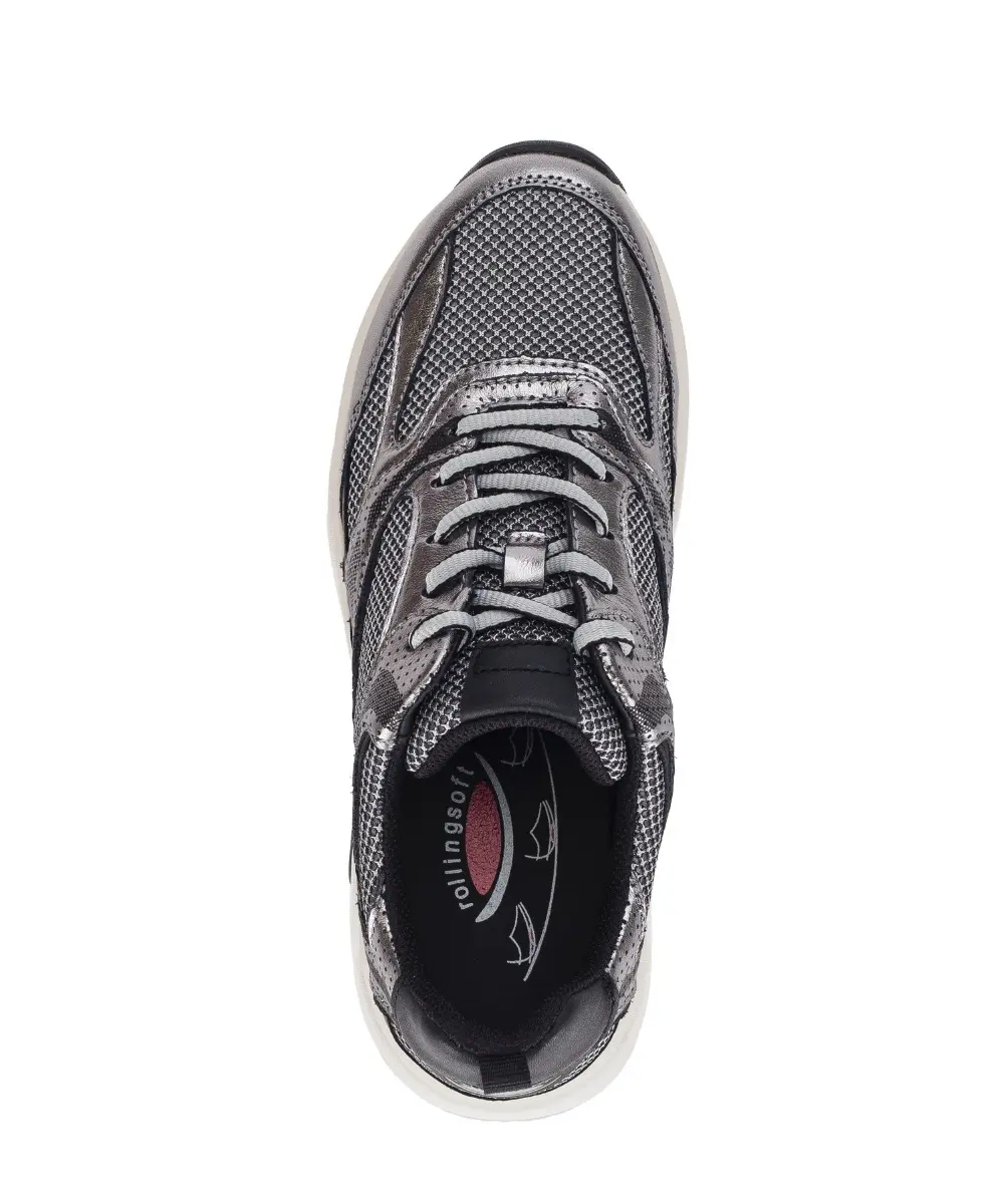 Deze Gabor Rollingsoft sneaker in een metallic zilveren kleur is een echte blikvanger met sportieve flair. De combinatie van mesh en glanzend materiaal geeft de schoen een luchtig en modern karakter. Dankzij de wijdte G en de lichtgewicht zool ervaar je optimale ondersteuning bij elke stap. De uitneembare binnenzool maakt de sneaker geschikt voor eigen steunzolen. Ideaal voor actieve dagen of een citytrip. Draag deze sneaker met een broek of een casual jurk voor een comfortabele en trendy look.
