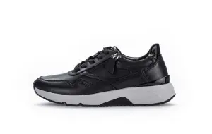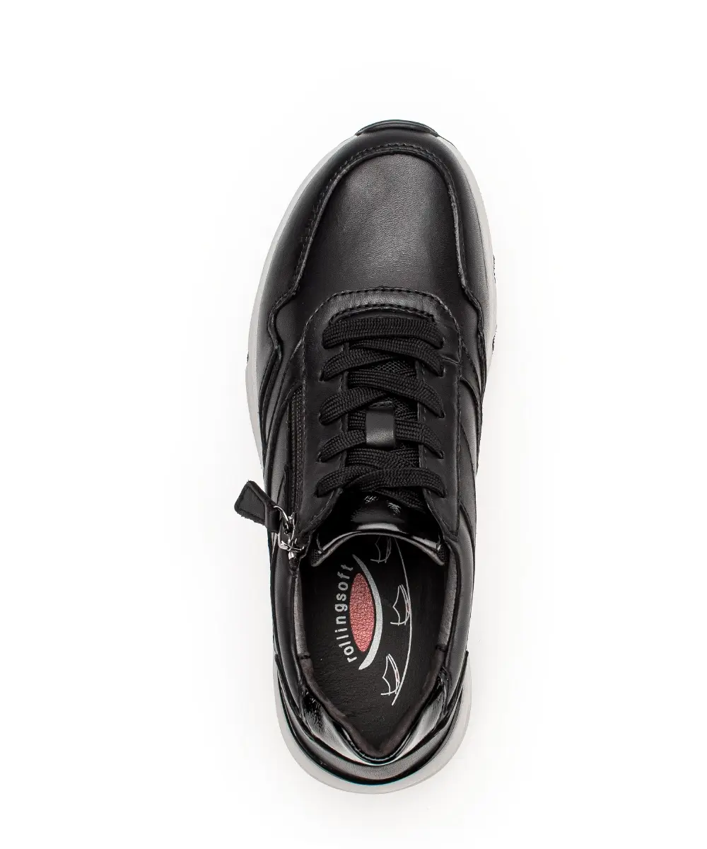 Deze zwarte Gabor basket van kalfsleer combineert tijdloze elegantie met modern loopcomfort. Het soepele kalfsleer voelt zacht aan en vormt zich moeiteloos naar je voet, terwijl de matte finish de basket een luxueuze en verzorgde uitstraling geeft. Dankzij het losse voetbed geniet je van optimale ondersteuning en kun je eenvoudig je eigen inlegzolen gebruiken voor extra comfort. De wijdte G biedt een aangename pasvorm met voldoende ruimte, ideaal voor dagelijks gebruik. De subtiele glanselementen en de strakke, moderne belijning geven deze basket een stijlvolle, hedendaagse look. Een veelzijdige keuze voor wie een klassieke schoen zoekt die moeiteloos comfort en klasse combineert.