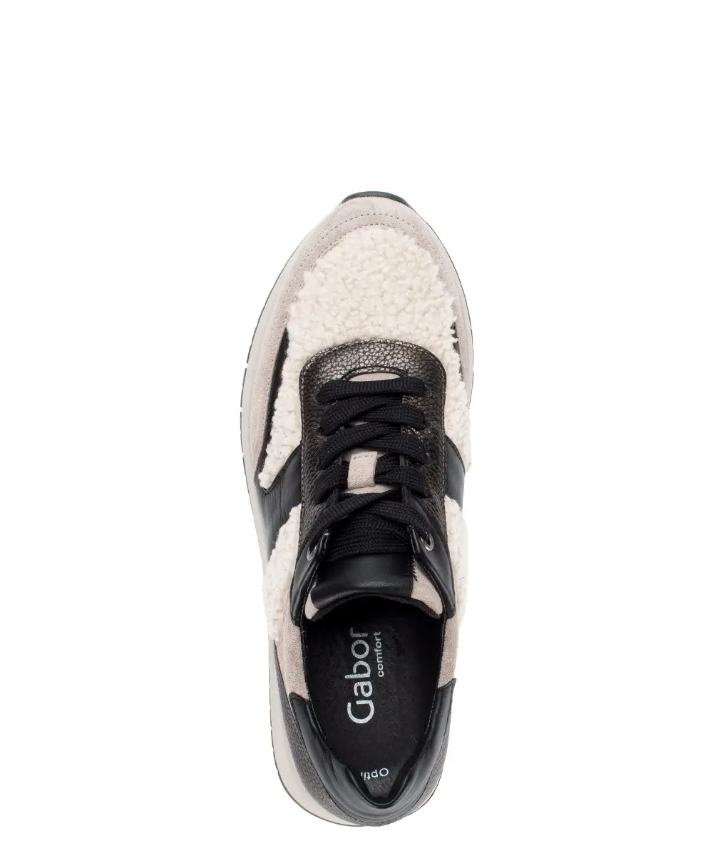 Deze beige met zwarte Gabor sneaker met teddy combineert uitgesproken stijl met dagelijks comfort. Het zachte materiaal geeft de schoen een warme najaar uitstraling. De wijdte H biedt extra ruimte, ideaal voor de bredere voet. De zwarte accenten geven deze sneaker een moderne, sportieve twist. Gun je voeten comfort en ervaar het verschil vandaag nog.