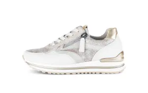 Deze Gabor basket in beige kalfsleer straalt elegantie en comfort uit. Het zachte leer vormt zich prettig naar je voet en heeft een fijne structuur die een moderne uitstraling geeft. De subtiele metallic accenten en de goudkleurige hiel voegen een vleugje luxe toe. De lichte zool zorgt voor een sportieve balans en voelt soepel aan tijdens het stappen. Dankzij het losse voetbed kun je moeiteloos je eigen inlegzolen gebruiken. De wijdte H biedt extra ruimte en maakt deze basket ideaal voor een iets bredere voet. De zachte voering en flexibele zool geven een aangenaam loopgevoel, ook wanneer je de hele dag onderweg bent. Deze beige basket past perfect bij een lichte jeans, een zomerjurk of een nette broek en geeft elke outfit een frisse en stijlvolle uitstraling.