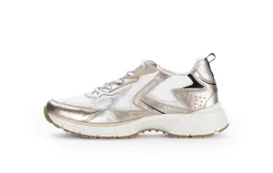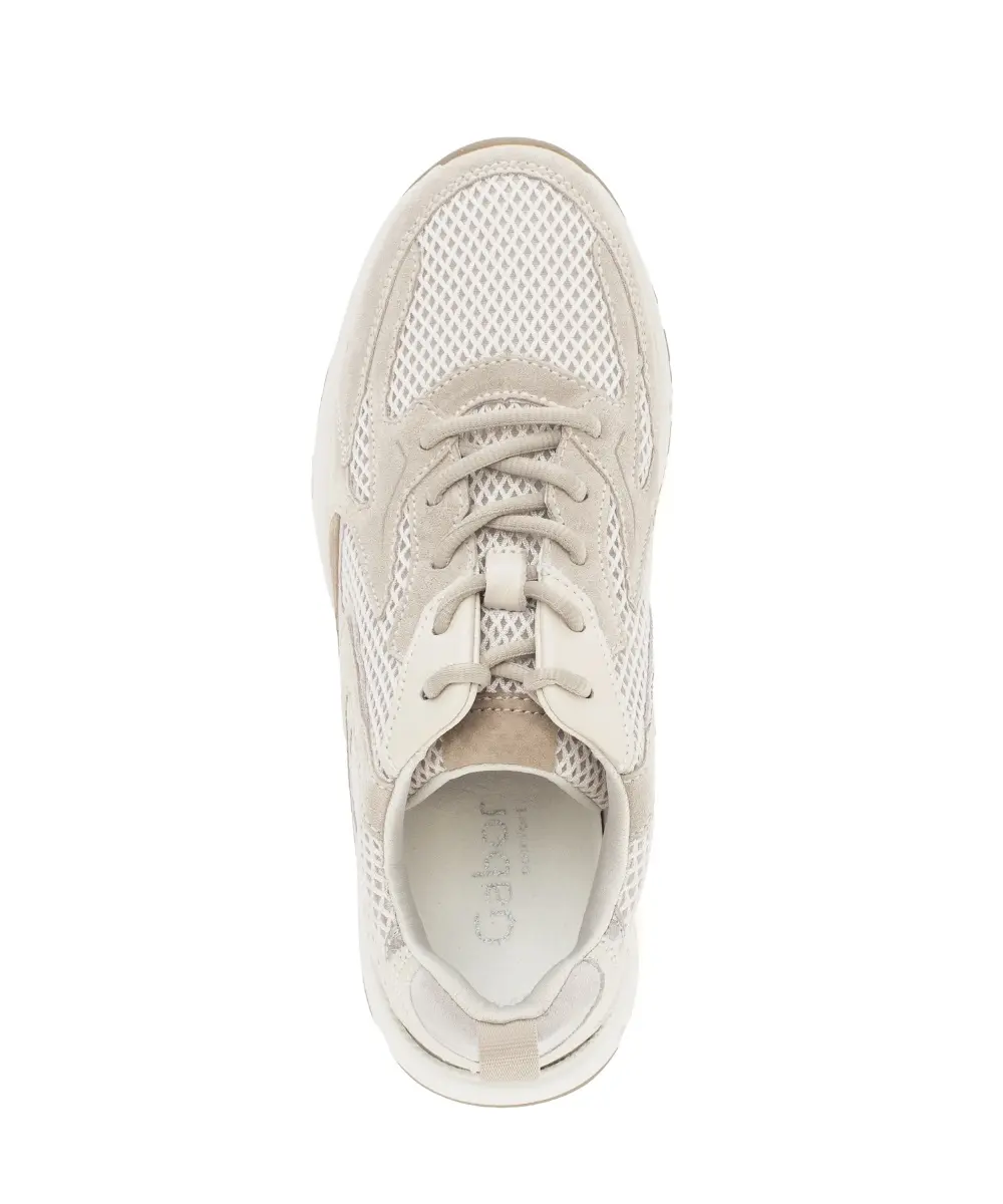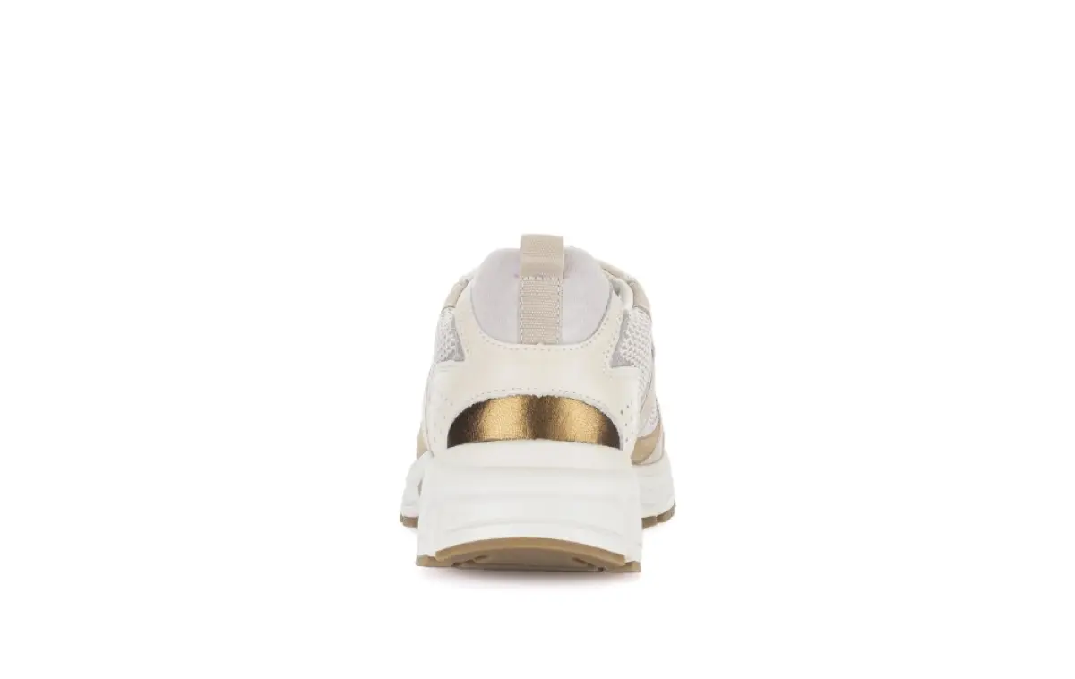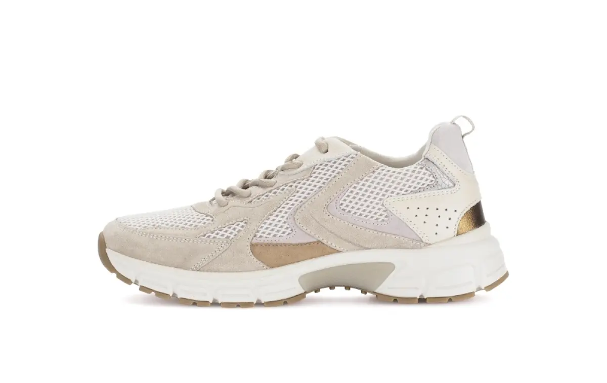 Deze beige Gabor basket van velours combineert een sportieve stijl met subtiele elegantie. De zachte tint krijgt extra diepte door de lichte glansaccenten en het goudkleurige detail op de hiel. Dat geeft de basket een verfijnde en moderne uitstraling. De luchtige inzetstukken en het speelse lijnenspel zorgen voor een frisse look die je makkelijk combineert met verschillende outfits. Het losse voetbed biedt comfortabel loopgemak en is geschikt voor eigen inlegzolen. Dankzij de wijdte G sluit de basket mooi aan bij de gemiddelde voet. Een ideale keuze als je houdt van comfort met een elegante, sportieve touch.