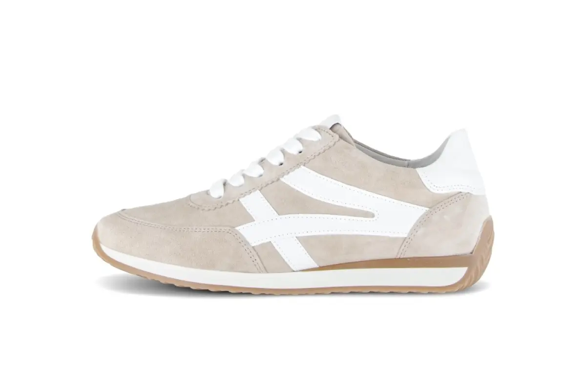 Deze beige Gabor basket van velours straalt tijdloze sportiviteit en comfort uit. Het zachte velour voelt prettig aan en geeft de basket een verfijnde uitstraling. De witte accenten aan de zijkant en op de hiel zorgen voor een frisse en moderne look. Het losse voetbed geeft extra draaggemak en maakt het mogelijk om eigen inlegzolen te gebruiken. De wijdte H biedt meer ruimte en is ideaal voor een iets bredere voet. De flexibele zool dempt elke stap en geeft een stabiel gevoel tijdens het lopen. De rubberen loopzool biedt goede grip op verschillende ondergronden. Deze beige basket van Gabor is een betrouwbare en comfortabele keuze voor elke dag.