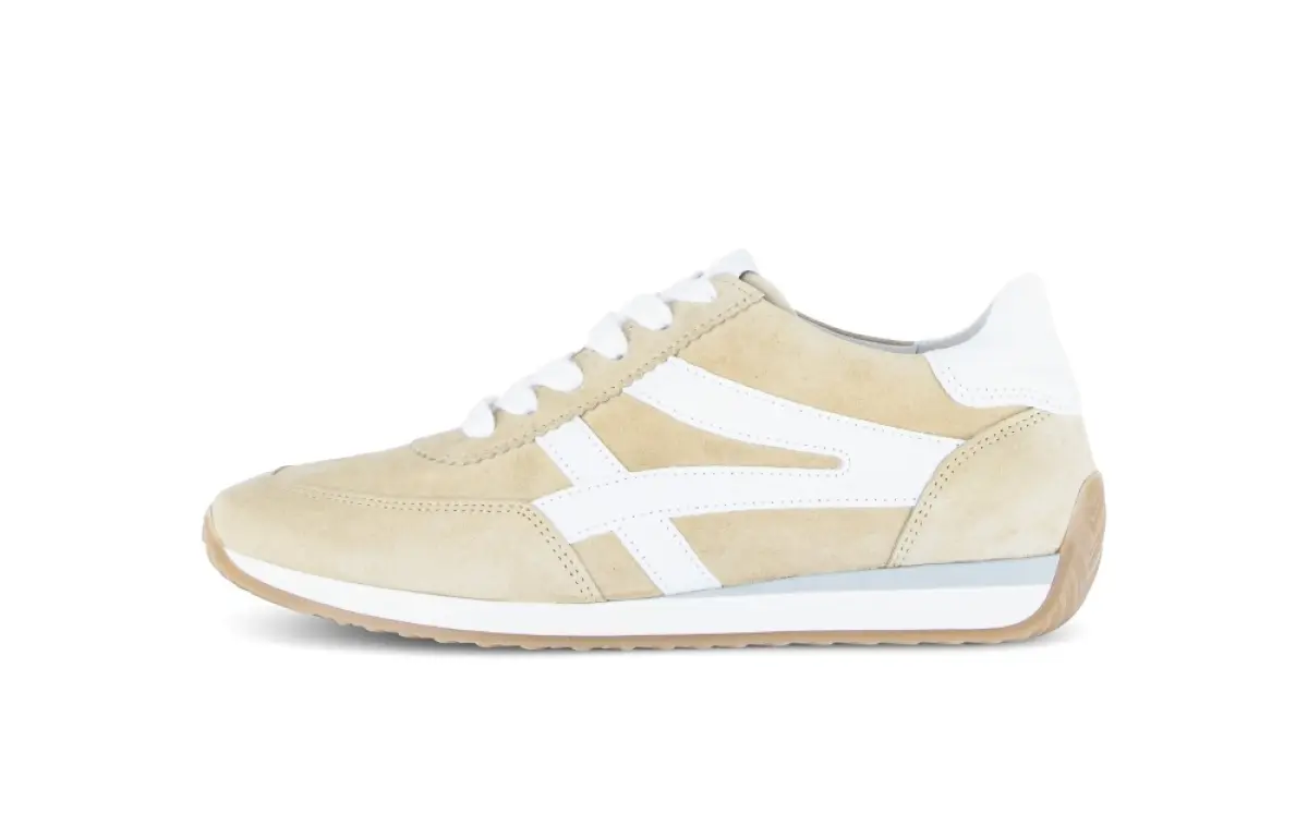 Deze beige Gabor sneaker van velours is een stijlvolle combinatie van sportiviteit en tijdloze eenvoud. Het zachte velours vormt zich prettig naar je voet en geeft de sneaker een elegante uitstraling. De witte details zorgen voor een frisse en moderne look die makkelijk past bij zowel casual outfits als verzorgde combinaties. Het losse voetbed biedt extra comfort en maakt de sneaker geschikt voor eigen inlegzolen. Dankzij de wijdte H ervaar je meer ruimte bij de voorvoet, wat ideaal is voor een iets bredere voet. De flexibele zool ondersteunt elke stap en voelt licht aan. Deze sneaker is een veelzijdige keuze voor vrouwen die comfort en stijl graag samen zien.