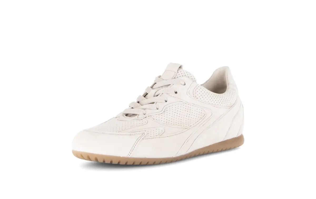 Deze beige Gabor sneaker van suède heeft een verfijnde uitstraling en voelt meteen comfortabel aan. Het zachte suède vormt zich soepel naar je voet. De subtiele perforaties zorgen voor een ademend en licht gevoel. Ideaal voor dagelijks gebruik. Het losse voetbed biedt extra comfort en maakt het mogelijk om je eigen inlegzolen te gebruiken. Dankzij de wijdte H heeft je voet meer ruimte en blijft de pasvorm ontspannen zonder te knellen. De lichte zool zorgt voor een soepele afwikkeling en fijne demping. Deze beige sneaker is een tijdloze keuze die stijl en draaggemak moeiteloos combineert en perfect past bij een moderne, casual look.