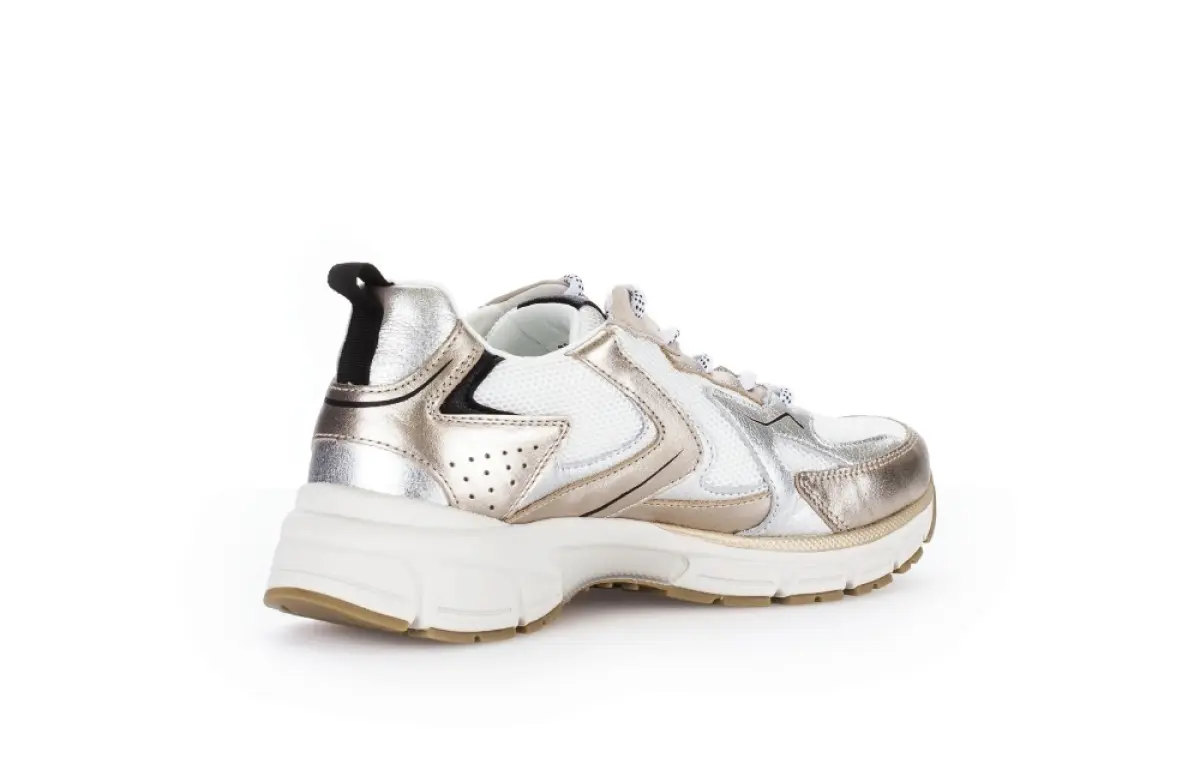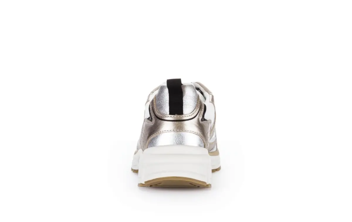 Deze goudkleurige Gabor basket van nappaleer straalt sportieve elegantie uit. Het metallic leer vangt het licht op en geeft de basket een luxe uitstraling. De combinatie met witte en zwarte accenten zorgt voor een moderne en frisse look. De inzetstukken van luchtig mesh houden je voet de hele dag fris en maken de basket ideaal voor dagelijks gebruik. Het losse voetbed biedt comfortabel steun en is geschikt voor eigen inlegzolen. De wijdte G geeft een natuurlijke pasvorm die mooi aansluit bij de gemiddelde voet. Deze goudkleurige basket is een stijlvolle keuze voor wie comfort wil combineren met een opvallende en elegante uitstraling.