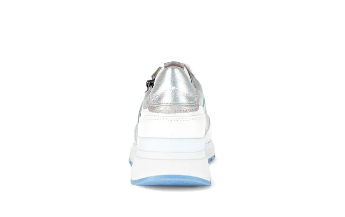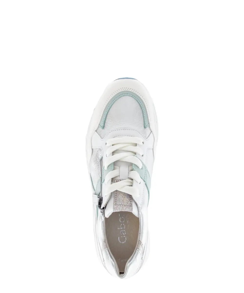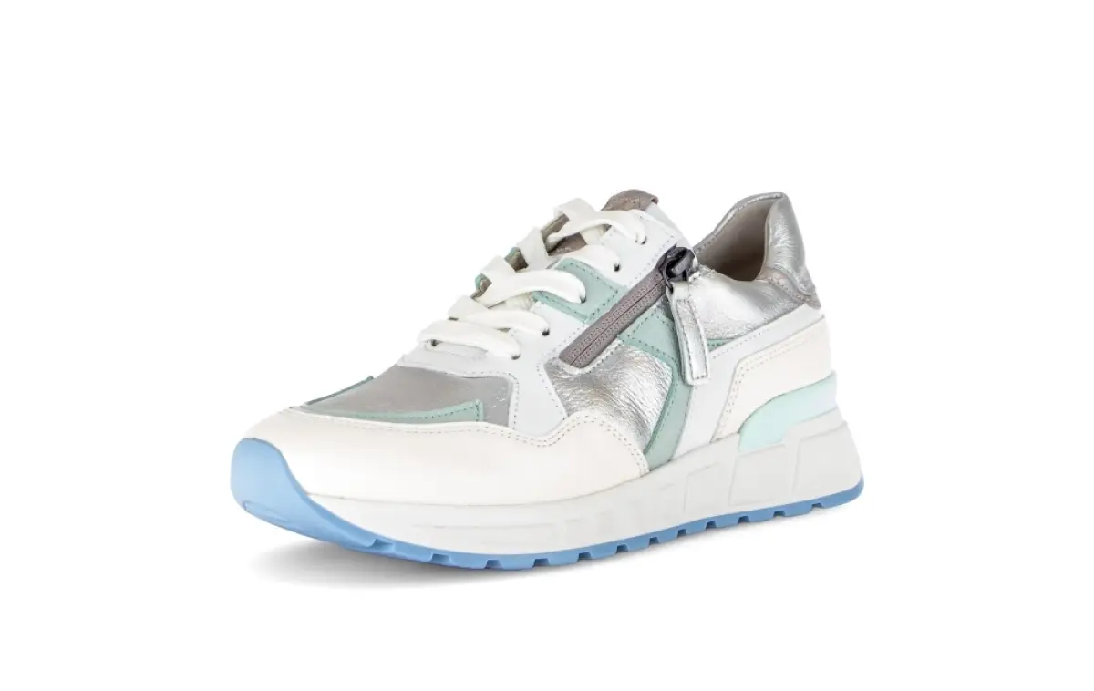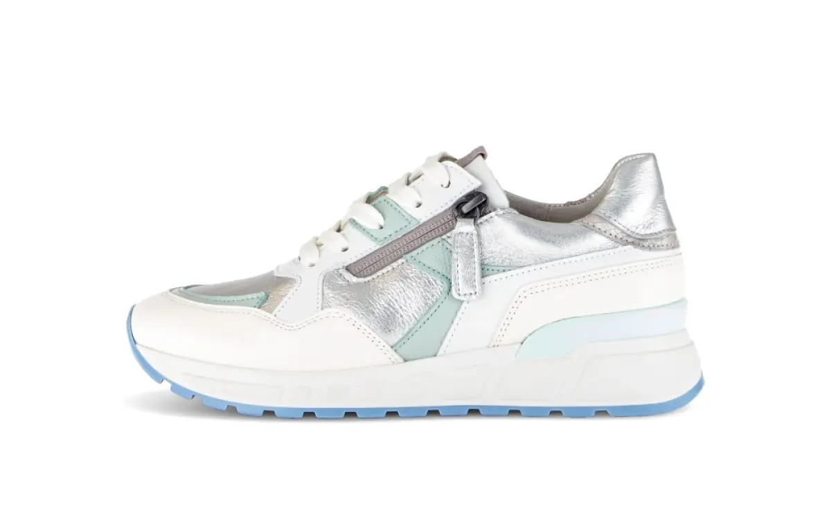 Deze lichtgroene basket van Gabor brengt frisse energie in je garderobe. Het zachte kalfsleer voelt aangenaam aan en vormt zich mooi naar je voet. De metallic accenten geven de basket een moderne uitstraling. De combinatie van pastelgroen en zilver valt subtiel op en blijft toch elegant. De blauwe zool zorgt voor een sportieve twist en maakt de look eigentijds. Dankzij de wijdte H heb je extra ruimte bij de voorvoet. Dat zorgt voor een comfortabele pasvorm. Het losse voetbed kun je eenvoudig vervangen door je eigen inlegzolen, ideaal voor wie extra ondersteuning nodig heeft. De stevige en lichtgewicht zool met zachte demping geeft comfort bij elke stap, de hele dag door. De ritssluiting naast de veters maakt aan- en uittrekken eenvoudig zonder dat de pasvorm verloren gaat. Deze lichtgroene basket past perfect bij casual outfits en brengt een frisse, moderne toets aan elke look.