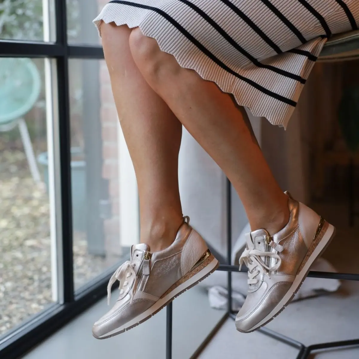 Deze basket van platina nappaleer van Gabor straalt klasse en comfort uit in één modern ontwerp. Het glanzende nappaleer voelt zacht aan en geeft de basket een luxueuze uitstraling, terwijl de subtiele goudaccenten zorgen voor een stijlvolle en eigentijdse touch. Dankzij de wijdte F (Best Fitting) sluit de basket mooi aan zonder te knellen, wat ideaal is als je iets meer ruimte aan de voorvoet wenst. Het losse voetbed biedt een goede ondersteuning en laat je toe om je eigen inlegzolen te gebruiken voor extra comfort op maat. De zijdelingse ritssluiting maakt het aan- en uittrekken eenvoudig en praktisch voor dagelijks gebruik. De platinakleur laat zich makkelijk combineren met lichte tinten of juist met sterke contrasten voor een elegante casual look. Zoals altijd bij Gabor geniet je van kwaliteit, draagcomfort en een pasvorm waarop je kunt rekenen.
