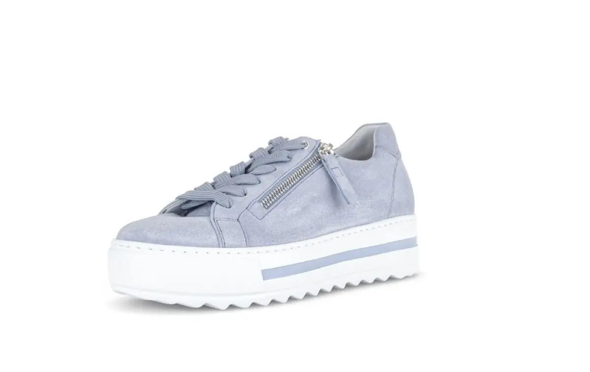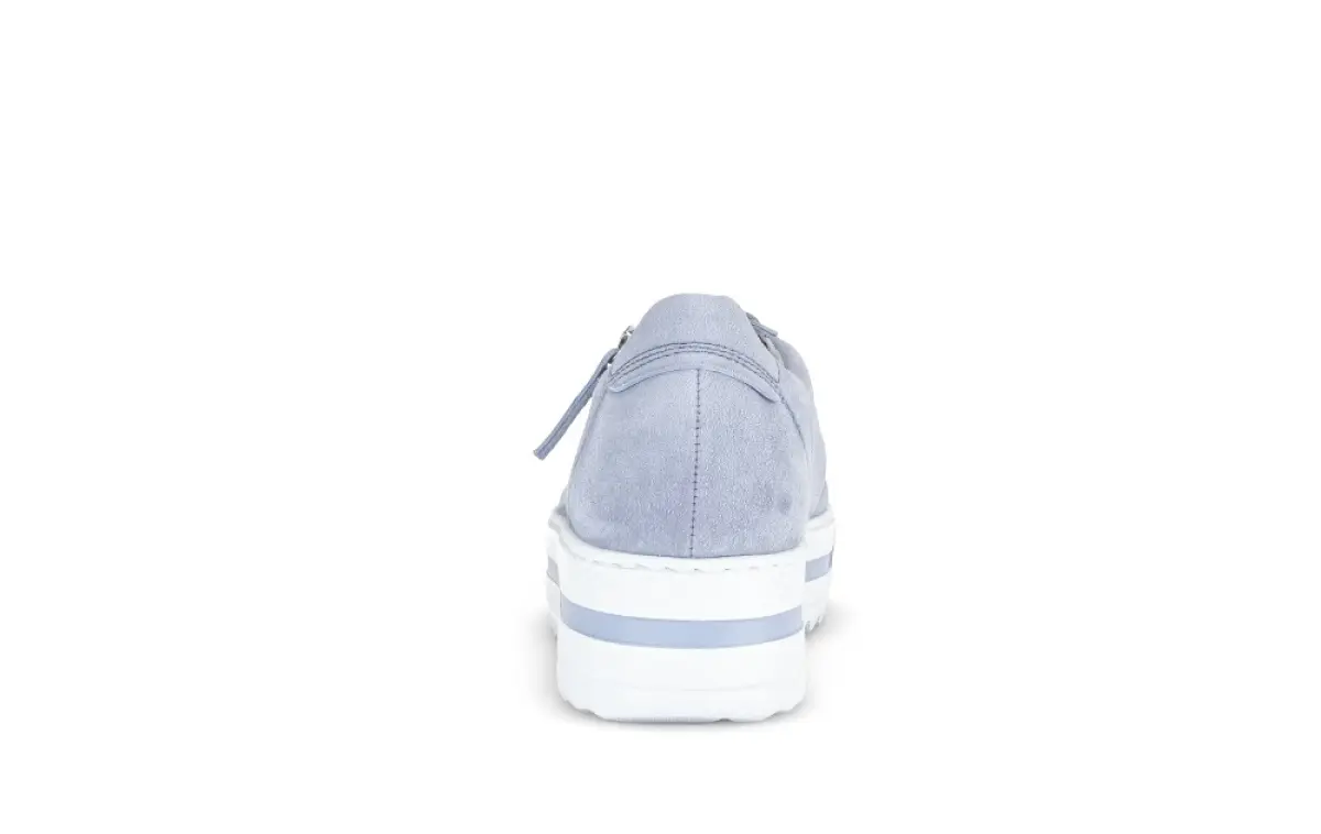 Deze lichtblauwe Gabor sneaker met platformzool biedt een moderne en sportieve uitstraling gecombineerd met ultiem draagcomfort. De zachte suède afwerking en handige ritssluiting maken deze sneaker ideaal voor dagelijks gebruik. Het subtiele blauwe accent in de zool zorgt voor een stijlvolle look. Combineer deze sneaker bijvoorbeeld met een witte jeans voor een frisse lente-look, of draag ze met een luchtige midi-jurk voor een vrouwelijke uitstraling.