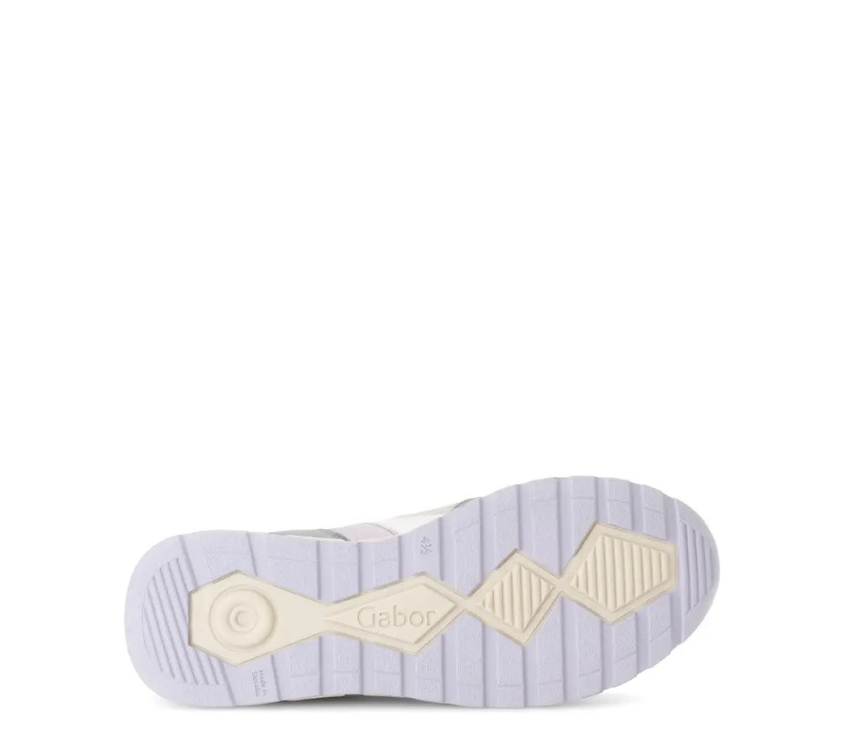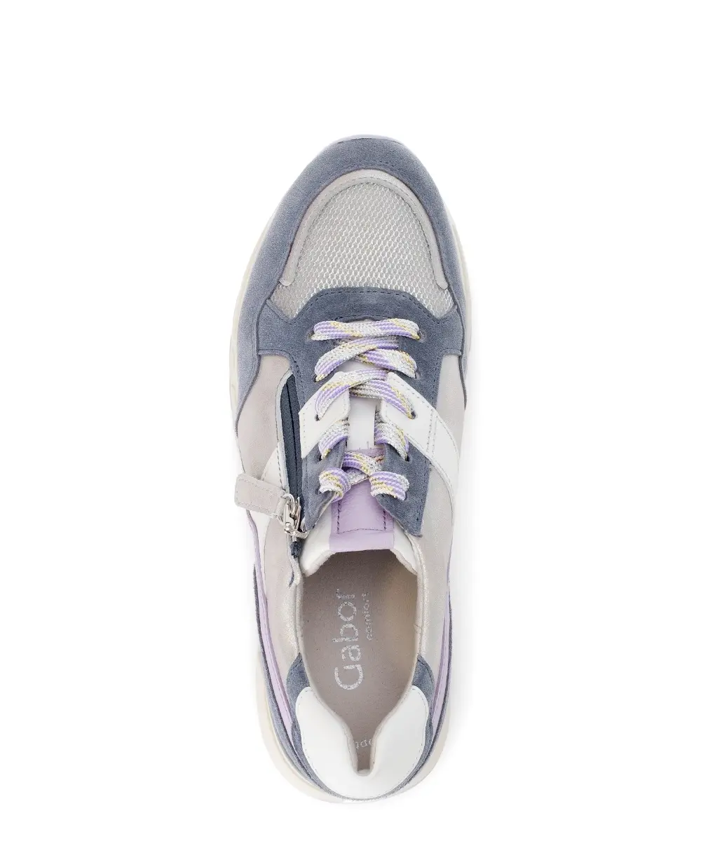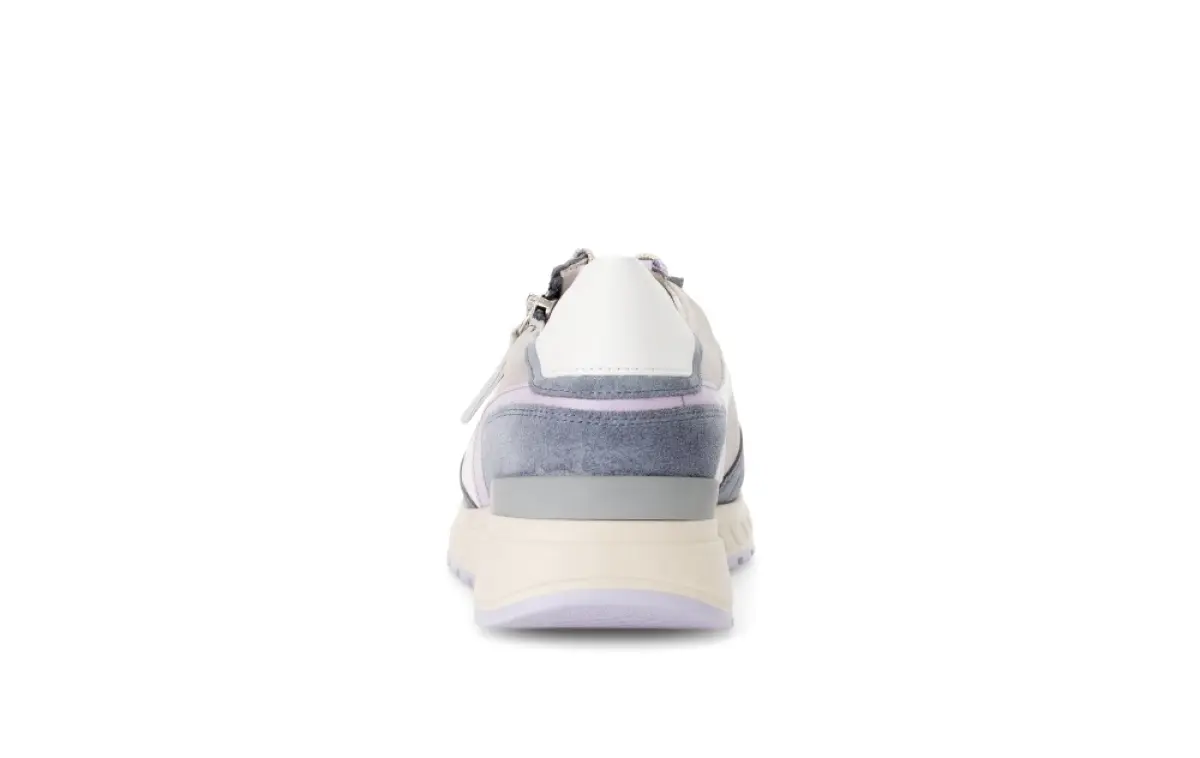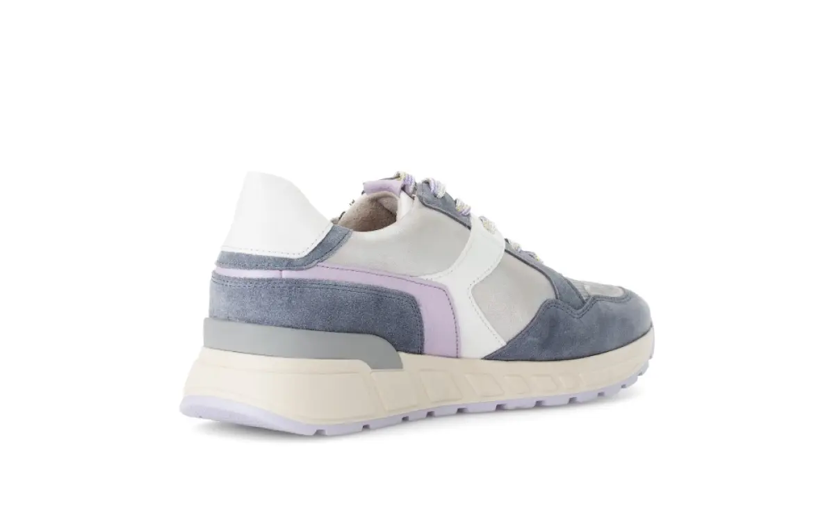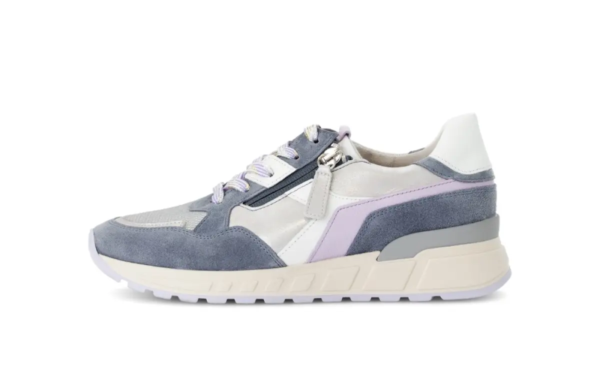 Deze Gabor sneaker van velours in de kleur sky is een frisse en vrouwelijke keuze. De zachte blauwtinten worden mooi aangevuld met lila en zilverkleurige accenten. Dat geeft de sneaker een moderne uitstraling die makkelijk te combineren is met lichte voorjaars- en zomeroutfits. Het velours voelt zacht aan en vormt zich soepel naar je voet. Dankzij het losse voetbed gebruik je zonder moeite je eigen inlegzolen. De wijdte H biedt extra ruimte voor de bredere voet. Zo geniet je van een comfortabele pasvorm zonder in te leveren op elegantie. De dikke, dempende zool zorgt voor stabiliteit en een aangenaam loopgevoel. Ideaal voor lange dagen of actieve momenten. De ritssluiting aan de zijkant maakt het aan- en uittrekken eenvoudig, terwijl de veters zorgen voor een nauwkeurige pasvorm. Deze blauwe sneaker combineert eigentijdse flair met het vertrouwde draagcomfort van Gabor.