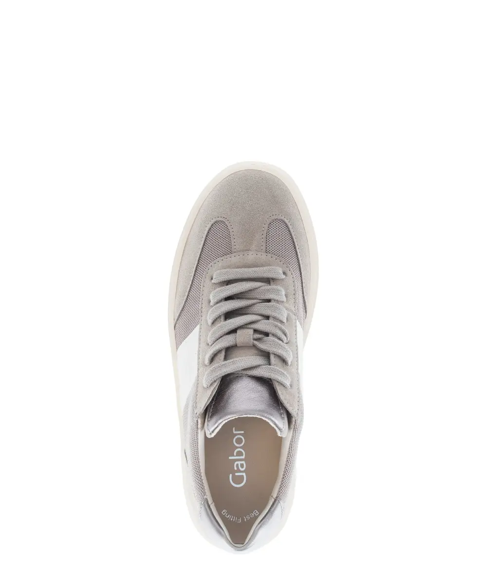 Deze basket van taupe suède van Gabor is een moderne en comfortabele keuze voor elke dag. Het zachte suède voelt soepel aan en sluit mooi rond je voet, terwijl de metallic hiel en de witte inzet zorgen voor een stijlvol contrast en een frisse, eigentijdse look. De plateauzool geeft de basket een trendy accent en biedt tegelijk extra demping en stabiliteit bij elke stap. Dankzij het losse voetbed kan je eenvoudig je eigen inlegzolen gebruiken voor ondersteuning op maat. De wijdte F (Best Fitting) geeft iets meer ruimte bij de voorvoet, zodat je zelfs na een lange dag nog comfortabel blijft stappen. De taupekleur maakt deze basket veelzijdig en makkelijk te combineren met zowel lichte zomertinten als casual denim. Zoals altijd bij Gabor geniet je van kwaliteit, draagcomfort en een pasvorm waarop je kunt vertrouwen.