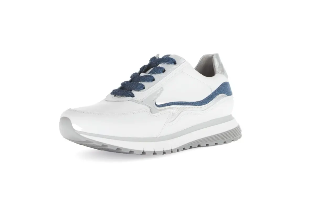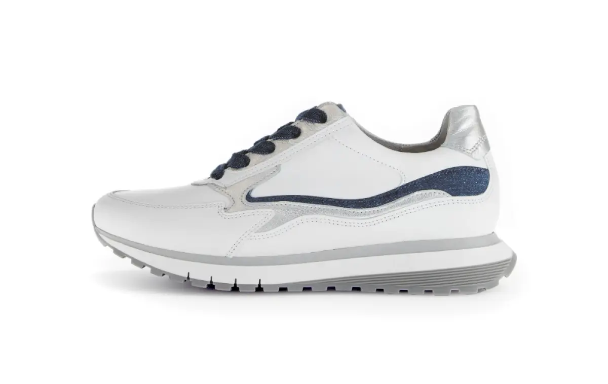 Deze witte Gabor sneaker met blauwe en zilverkleurige details is de perfecte combinatie van stijl en comfort. Het soepele nappaleer en de zool zorgen voor een aangename pasvorm en ondersteuning bij elke stap. De donkerblauwe veters en accenten geven een sportieve uitstraling, terwijl de subtiele zilveren hiel een luxe touch toevoegt. Ideaal voor dagelijks gebruik, of je nu een casual of sportieve look wilt. Combineer de sneaker bijvoorbeeld met een jeans en een blazer voor een casual-chique look, of draag ze met een luchtige zomerjurk voor een sportief en vrouwelijk accent. De blauwe details matchen perfect met denim voor een frisse, tijdloze uitstraling.
