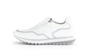 Deze witte sneaker van Gabor met warme cognac stiksels is dé perfecte balans tussen een sportieve look en stijlvolle details. Het minimalistische ontwerp krijgt een speels accent door de contrasterende stiknaden en de zool met een natuurlijke tint.